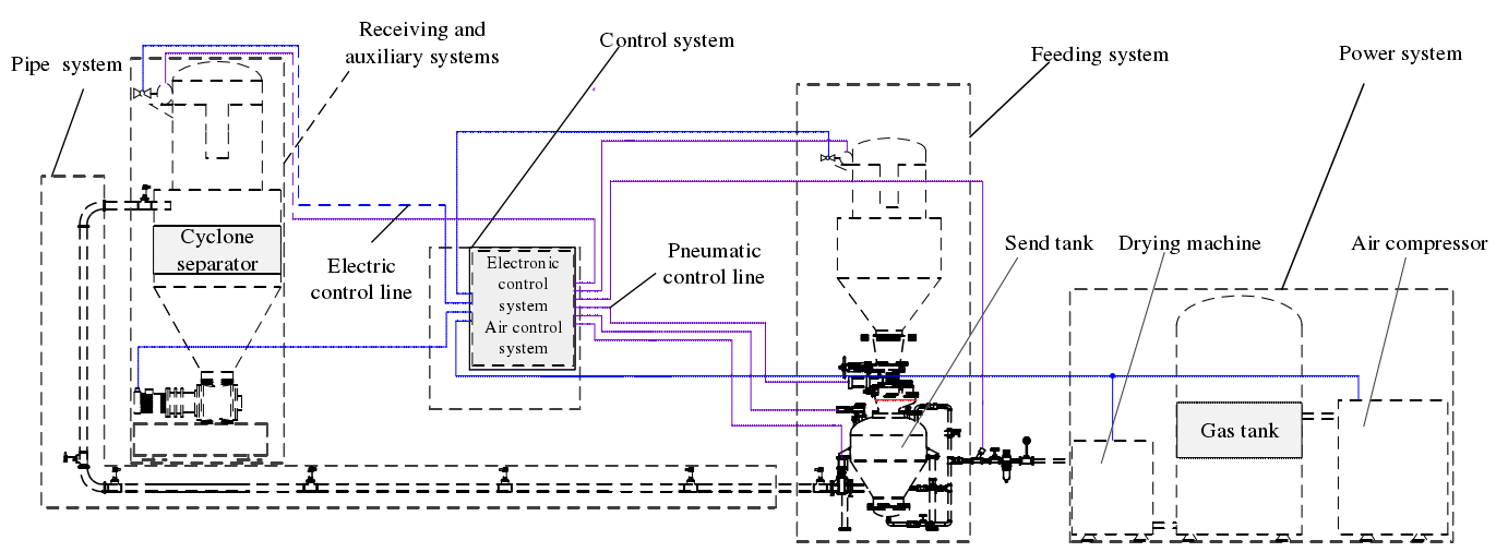 (1)动力系统:主要由空气压缩机、干燥机、储气罐等组成,是整个输送系统的动力源;