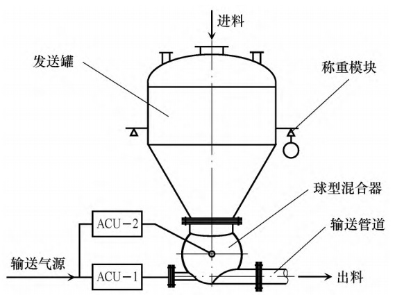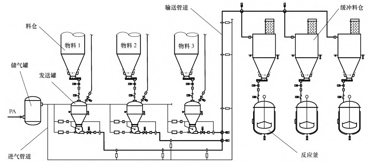 浓相气力输送系统具有输送效率高、能耗低、管道磨损小等优点。根据精细化工行业的生产特点,一般选择发送罐进行浓相气力输送。