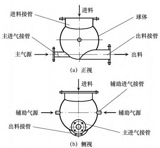 球型混合器是发送罐组件的核心部件,安装在发送罐底部出口,是针对流动性很差的粉状和计量工艺需求开发的,起到了暂时储存和流化物料的重要作用,这样既保证了输送的安全可靠性,又能保证输送无残留,从而满足了系统的计量精度要求。