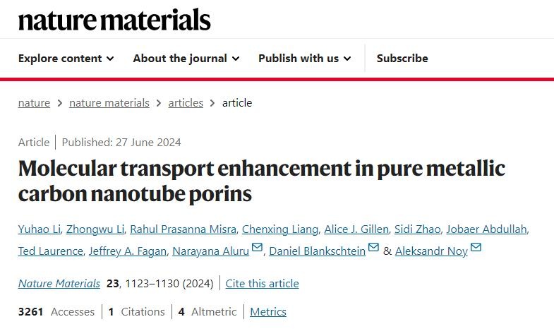 劳伦斯利弗莫尔国家实验室的研究人员测量了通过亚1纳米金属和半导体碳纳米管孔内孔的传输。发现与半导体纳米管相比,金属纳米管中的水和质子传输得到增强,而离子传输对纳米管带隙值基本不敏感。使用可极化力场的分子模拟突出了碳纳米管的各向异性极化率张量对离子-纳米管相互作用和水摩擦系数的贡献。研究人员还使用深度神经网络分子动力学模拟描述了金属纳米管中质子传输增强的起源。这些结果强调了纳米流体通道的电子特性在极端纳米级限制下调节传输的复杂作用。