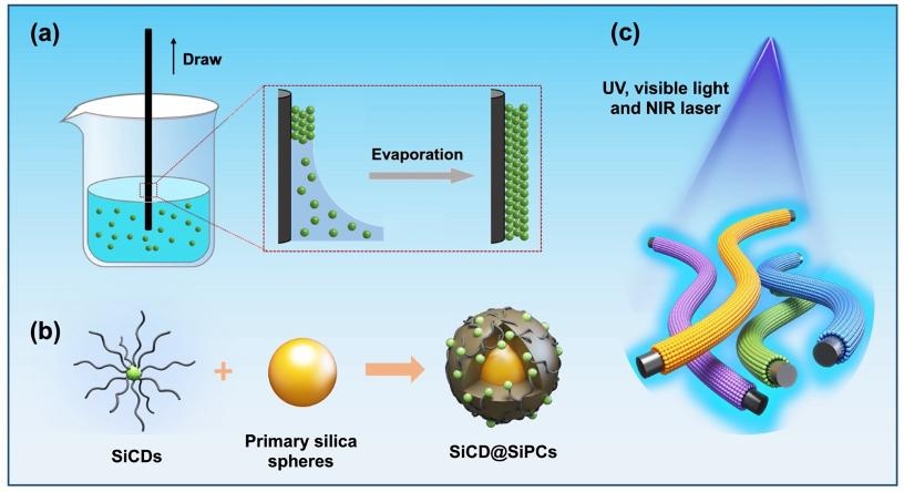清华大学张如范教授在多功能碳纳米管纤维方面取得突破,将硅烷功能化的碳纳米点(SiCDs)、二氧化硅光子晶体(SiPCs)和碳纳米管纤维(CNTFs)相结合,实现了碳纳米管纤维的结构致色和光致发光,制备出了具有紫外线探测功能的彩色碳纳米管纤维。