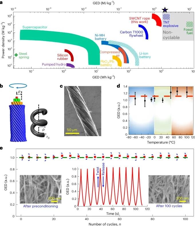 日本信州大学Katsumi Kaneko教授课题组通过实验证明了扭曲SWCNT绳在机械能存储上的显著潜力。实验表明,使用热塑性聚氨酯(TPU)改性的扭曲SWCNT绳能安全且可逆地存储大量机械能,展现出高达2.1±0.07MJkg-1的能量密度和1.85±0.43MWkg-1的功率密度。这些绳索的机械能存储性能在广泛的温度范围内稳定,与电化学存储介质相比具有更宽的适用温度范围和更高的安全性。此外,经过预处理的扭曲SWCNT绳显示出高效的能量回收能力和循环稳定性,即使在100次循环之后,能量恢复比几乎保持不变。这项研究强调了SWCNT作为未来能量存储介质的巨大潜力。