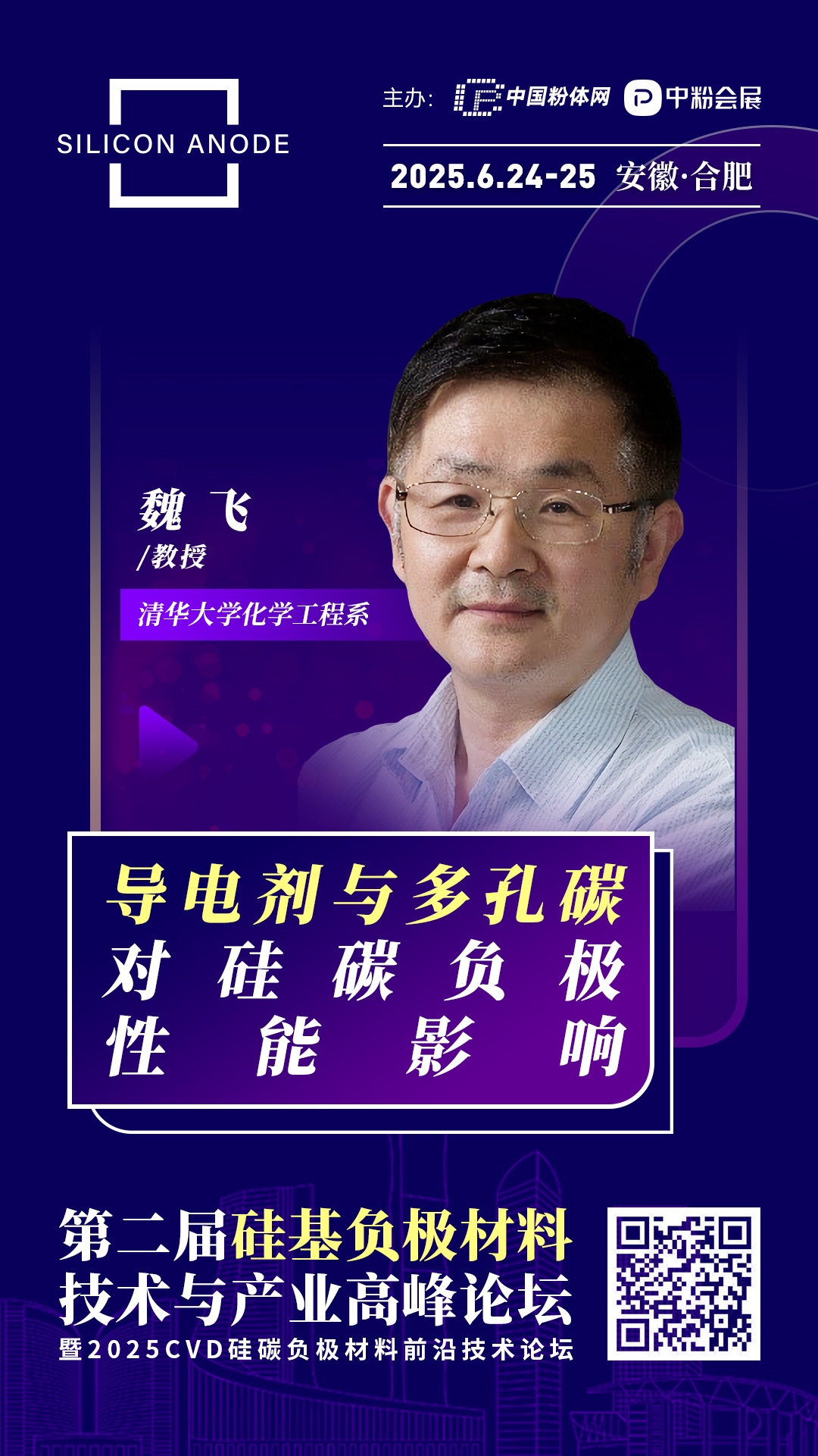 针对各类负极材料的产业化技术与国内外市场状况,中国粉体网将于2025年6月24-25日在安徽·合肥举办第二届硅基负极材料技术与产业高峰论坛暨2025CVD硅碳负极材料前沿技术论坛。旨在为负极材料产业链上中下游企业搭建深度交流的平台,开展产、学、研合作,助推负极材料行业持续健康发展。届时,清华大学魏飞教授将作题为《导电剂与多孔碳对硅碳负极性能影响》的报告。