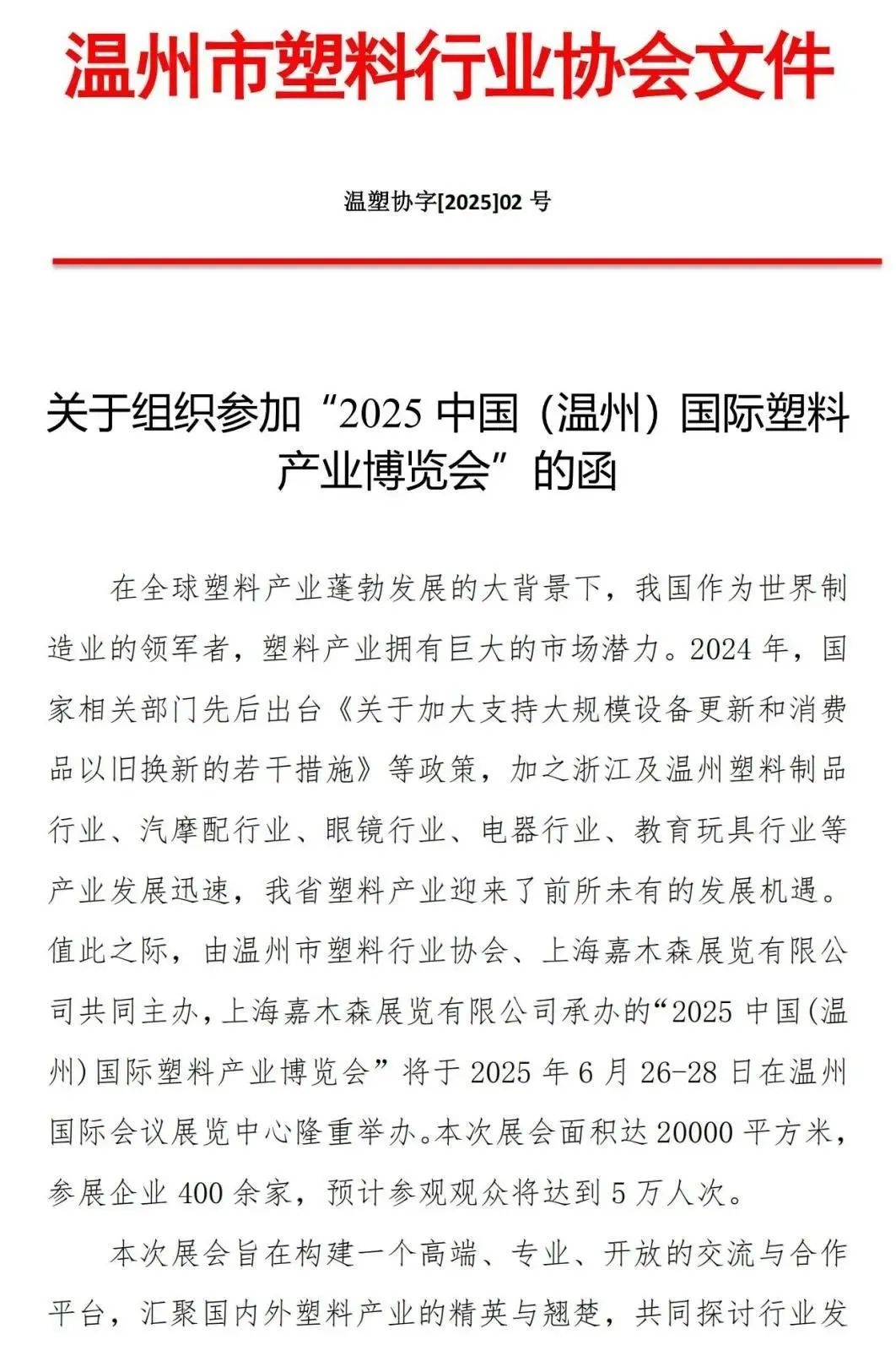 2025中国温州国际塑料产业博览会,将于6月26-28日,在温州国际会议展览中心。(鹿城区)隆重开幕。现邀请贵单位及成员企业共襄盛会: