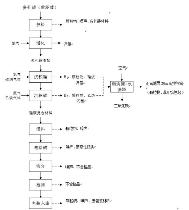 据悉,赣州立探新能源科技有限公司在建项目包含“年产300吨新型硅碳负极材料建设项目”,该项目拟采取CVD法制备硅碳负极材料,主要工艺为:投料→活化→沉积硅→沉积碳→混料→电除磁→筛分→包装。