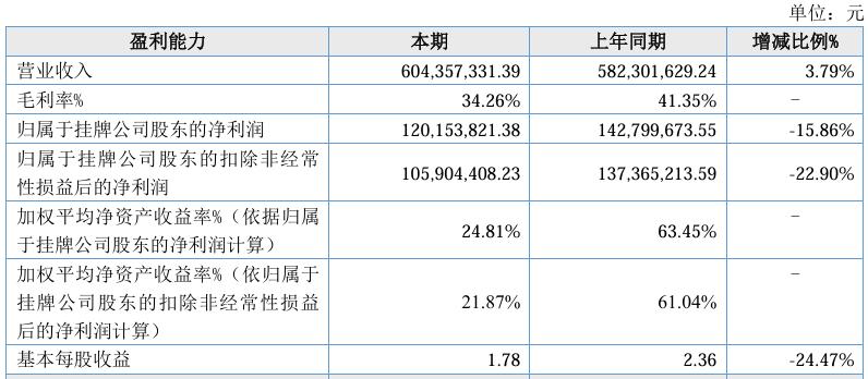 龙鑫智能2024年度,营收6.04亿元,比上年同期增长3.79%;归属于挂牌公司股东的净利润1.20亿元,比上年同期减少15.86%。