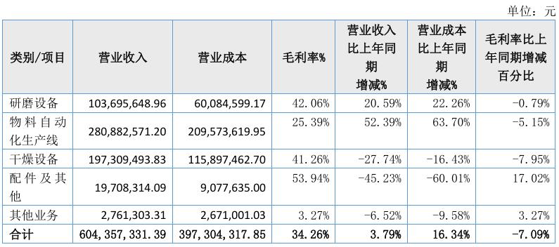 年报显示,公司的主营业务收入由研磨设备、物料自动化生产线、干燥设备、配件及其他构成。