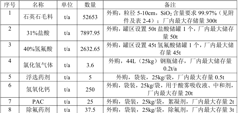 拟建项目主要原辅材料及动力消耗一览表(部分)
