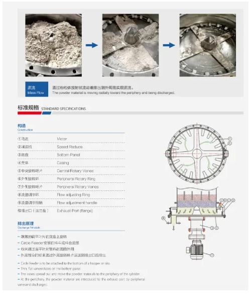 • 卸料盘根据物料流动特性,可采用30、40、45、55不同锥度,适用于各种粉料和糖料;