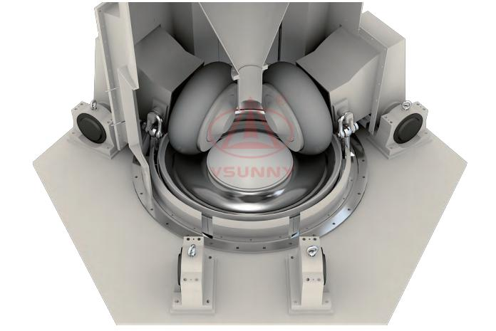 6) 经“立磨主机”研磨后,物料被磨机内强大的负压气流吸起,被抽送到立磨顶部的“气流分级机”中,然后调整分级轮的转速对粉体进行分选。细度合适的粉体会随着负压气流一起会穿过分级轮,被送至“脉冲除尘器”。而细度过大的颗粒会被打回磨盘中继续研磨;