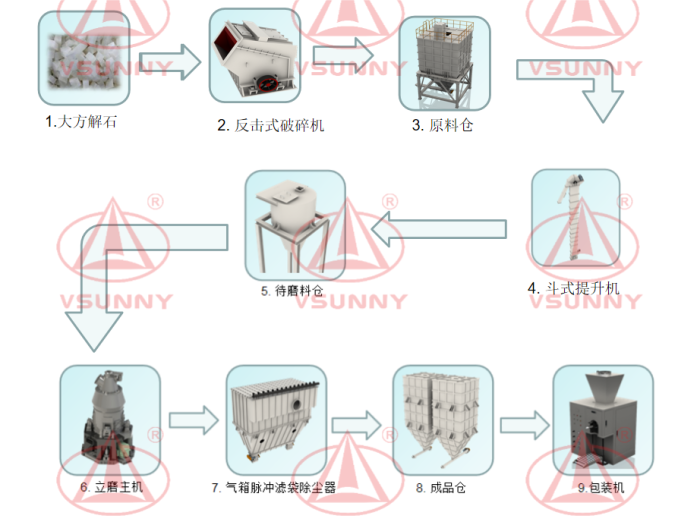 9) 成品从“成品仓”出来后会用自动包装机进行包装,就是将粉体装进25KG袋子或吨袋,再经过自动抓包、码垛后存放在卡板上。