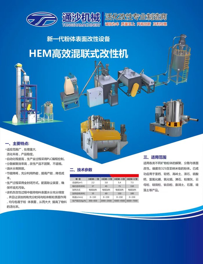 公司研发了新型HEM高效混联式改性机,产品质量稳定提高,操作简单,节能降耗效果显著。另有GX-10至GX-1300小型至大型粉体表面改性机。适用于各种生产能力及各种粉体种类。包括:轻(重)质碳酸钙、高岭土、重晶石、滑石、长石、石墨、叶蜡石、水镁石、硅藻土、氧化铝、氢氧化铝、氧化镁、氧化锌、硅微粉、硅灰石、黑硅石、沸石等。经过几年的潜心开发与研究,生产设备得到进一步的完善,目前已成为粉体深加工生产的设备厂家。