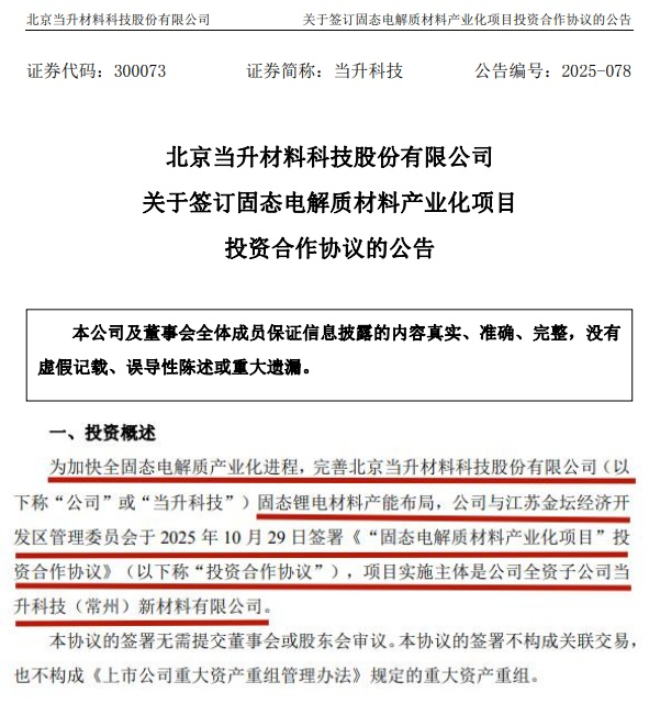 中国粉体网讯 10月29日,北京当升材料科技股份有限公司(简称:当升科技)发布公告称,为加快全固态电解质产业化进程,完善固态锂电材料产能布局,公司与江苏金坛经济开发区管理委员会签署《“固态电解质材料产业化项目”投资合作协议》,项目实施主体是当升科技全资子公司当升科技(常州)新材料有限公司(简称:常州当升)。