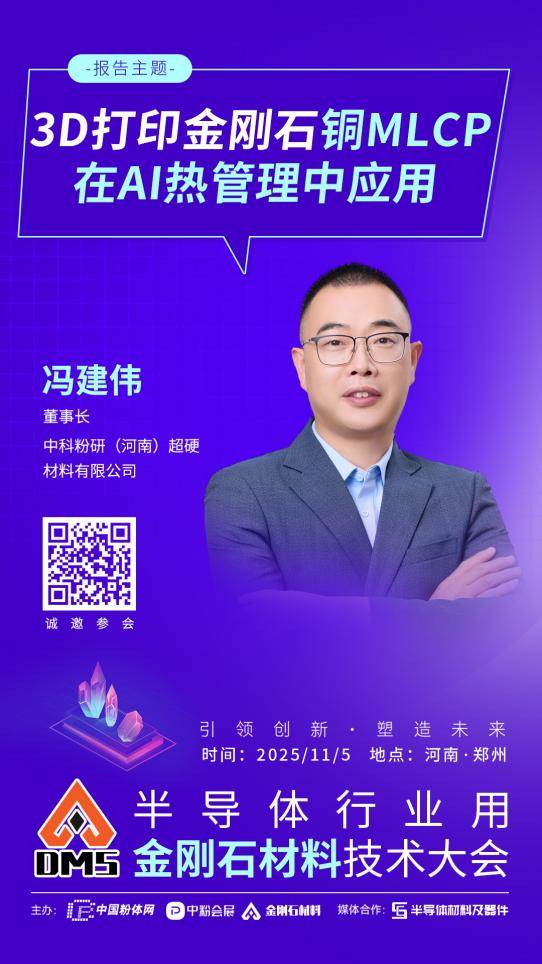 2025年11月5日,中国粉体网将在河南•郑州举办“2025半导体行业用金刚石材料技术大会”。届时,来自中科粉研(河南)超硬材料有限公司董事长冯建伟将带来《3D打印金刚石铜MLCP在AI热管理中应用》的报告。报告将基于金刚石增材制造技术的铜制微通道液冷板MLCP方案进行分享交流。