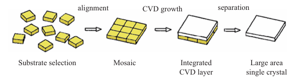 目前制备大尺寸单晶金刚石的技术主要有反复生长法、异质外延法和马赛克拼接法。马赛克拼接法是精选厚度一致、晶向取向一致、方形的优质小金刚石单晶片作为籽晶,并拼接成面积较大的单晶金刚石衬底,其中,必须保证种晶接触位置的晶向要尽可能完美匹配,然后在较大的单晶金刚石衬底上同质外延生长单晶金刚石,最后得到大面积单晶金刚石。由于合成的单晶衬底缺陷与位错密度小,因此马赛克拼接法是目前研究合成英寸级单晶金刚石最优的技术。