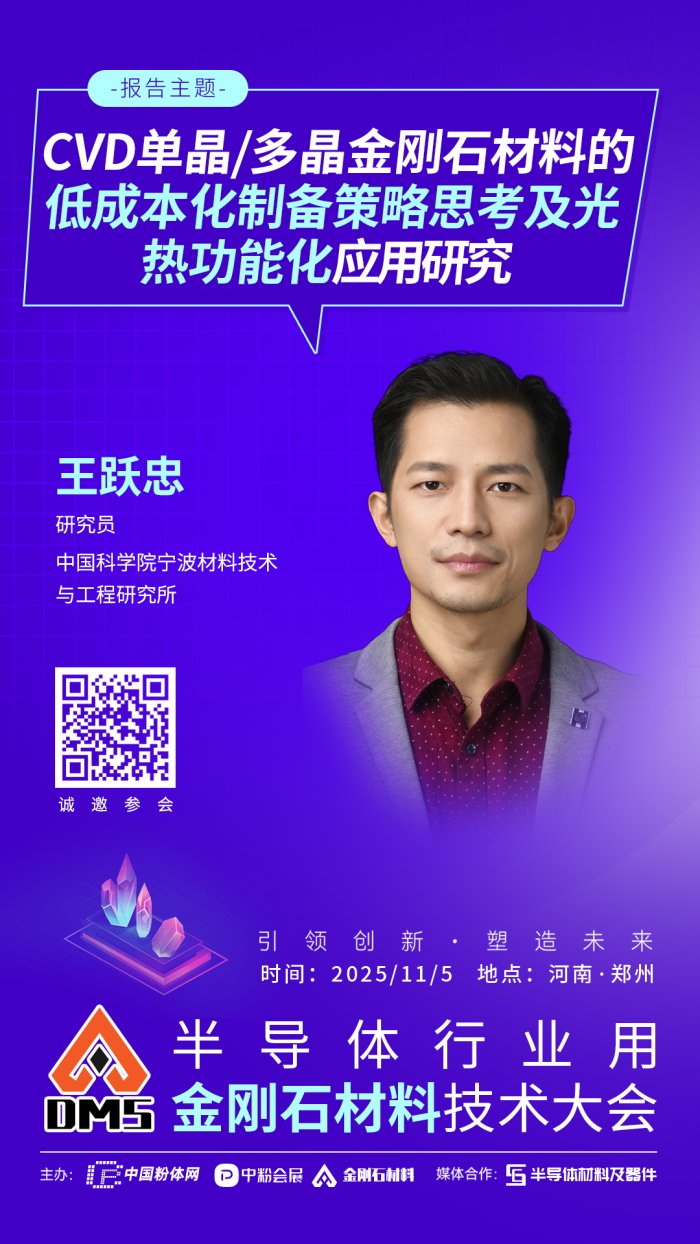 2025年11月5日,中国粉体网将在河南•郑州举办“2025半导体行业用金刚石材料技术大会”。届时,我们将邀请到中国科学院宁波材料技术与工程研究所王跃忠研究员出席本次大会并作题为《CVD单晶/多晶金刚石材料的低成本化制备策略思考及光热功能化应用研究》的报告。报告将介绍大尺寸单晶金刚石(马赛克拼接法)、多晶金刚石薄膜制备及应用等相关成果,为金刚石材料的低成本化应用提供参考。
