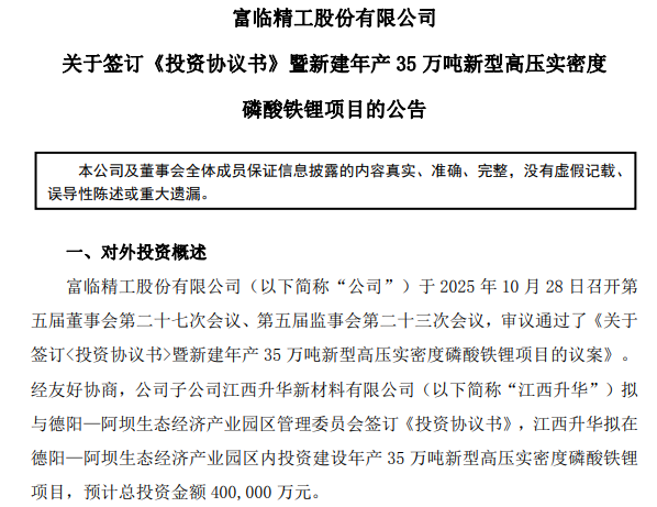 10月29日,富临精工发布公告称,子公司江西升华拟与德阳—阿坝生态经济产业园区管理委员会签订《投资协议书》,江西升华拟在德阳—阿坝生态经济产业园区内投资建设年产35万吨新型高压实密度磷酸铁锂项目,预计总投资金额40亿元。