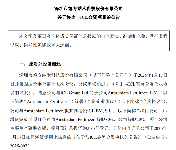 根据公告,德方纳米于今年1月与ICL集团旗下子公司Amsterdam Fertilizers B.V.签署《合资企业协议》,双方计划共同向ICL BM, S.L.增资。增资完成后,Amsterdam Fertilizers将持股80%,德方纳米持股20%,原定主要开展磷酸铁锂正极材料的生产。然而,随着项目推进,市场环境、国际政策与公司战略等多方面因素发生变化,严重影响项目经济性与预期收益。经双方审慎评估与友好协商,最终决定终止该合作,以优化资源配置,降低投资风险。