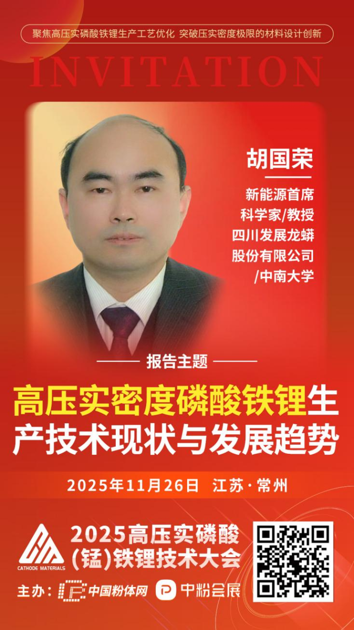 为促进磷酸铁锂产业交流与技术合作,中国粉体网将于2025年11月26日在江苏常州举办“2025高压实磷酸(锰)铁锂技术大会”。届时,来自中南大学/四川发展龙蟒股份有限公司的胡国荣教授/新能源首席科学家将作《高压实密度磷酸铁锂生产技术现状与发展趋势》的报告,胡教授将介绍高压实密度磷酸铁锂的定义、合成路线、加工成本、高压实磷酸铁锂的溢价以及高压实磷酸铁锂的市场需求和生产企业。