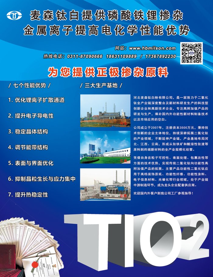 河北麦森钛白粉有限公司是一家致力于二氧化钛全产业链深度整合及新材料研发生产的科技型创新企业和高新技术企业,秉持技术创新的企业主体地位,持续深耕拓展二氧化钛的产业领域,不断延伸产业链,产业基地布局河北、江西、云南,形成从钛铁矿和酸溶性钛渣等原料到终端新材料的全产业规模化经营。凭借自身在粒子可控性、表面处理、包裹改性等方面的技术优势,实现传统二氧化钛向功能性高附加值产品的拓展,包括电子产品专用、高介电常数纳米陶瓷电容专用、储能电池高阻值隔膜、高性能纳米钛酸锂电池负极材料、吸附核放射元素纳米材料、反红外隔热、防电磁辐射以及系列光催化降解大气污染、污水处理、抗菌杀菌、土壤修复、绿色叶面肥、食品、医药、彩妆功效粉体等高附加值材料。