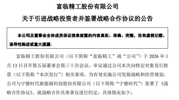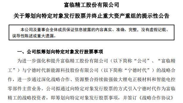 中国粉体网讯 1月13日晚间,富临精工发布系列公告,宣布终止此前筹划的重大资产重组,转而启动向特定对象发行股票,引入全球动力电池龙头宁德时代作为战略投资者,并签署了全面的《战略合作协议》。