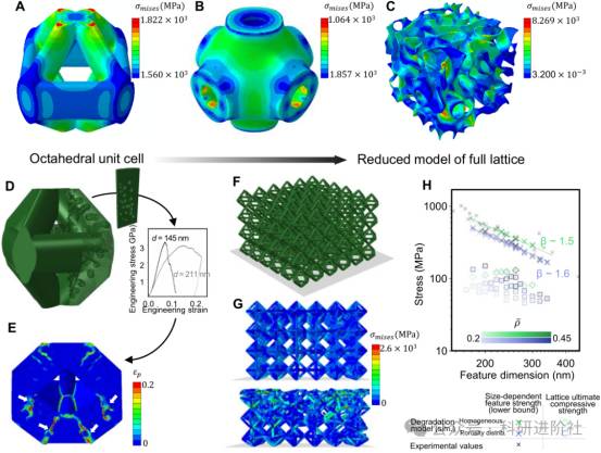 镍纳米架构在特征尺寸100-500纳米范围内展现出卓越的力学性能,比强度最高可达约100MPa·g-1·cm3,显著优于许多现有材料体系。研究团队建立了物理约束的多层级有限元模型,能够定量预测不同拓扑、密度与尺寸下的强度标度关系,为纳米架构的设计优化提供了可靠工具。