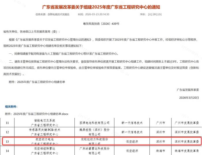 近日,广东省发展和改革委员会近日发布通知,欣旺达将牵头组建“航空动力电池广东省工程研究中心”,重点研发高安全、高比能的固态航空动力电池技术。该中心将瞄准航空器动力电池这一前沿领域,重点研发高安全、高比能的固态航空动力电池,旨在突破关键技术瓶颈,为广东省打造世界级低空制造高地、培育新质生产力提供核心动力支撑。