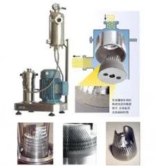 由电动机通过皮带传动带动转齿(或称为转子)与相配的定齿(或称为定子)作相对的高速旋转,被加工物料通过本身的重量或外部压力(可由泵产生)加压产生向下的螺旋冲击力,透过胶体磨定、转齿之间的间隙(间隙可调)时受到强大的剪切力、摩擦力、高频振动等物理作用,使物料被有效地乳化、分散和粉碎,达到物料超细粉碎及乳化的效果。
