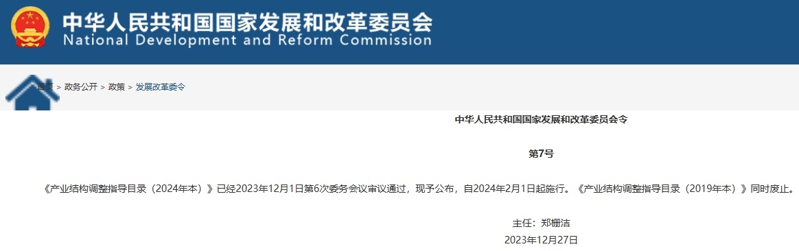 中国粉体网讯 据悉,《产业结构调整指导目录(2024年本)》已经2023年12月1日第6次委务会议审议通过,并正式公布,自2024年2月1日起施行。《产业结构调整指导目录(2019年本)》同时废止。
