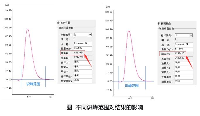 动态色谱法的比表面积测试仪测试原理详见国标GB/T19587-2004,它的优势在于短期使用成本较低,用于企业自身品控环节的参照数据尚可,用于产品品质数据还是需要推敲的。动态色谱法测试过程中需要使用”标准样品”作为测试依据,但就是这个“标物”存在着影响精度和稳定性的大问题。动态色谱法在测试过程中标物使用的是“绝对值”,而标物的实际情况是有不确定度的,如:N990炭黑比表面积为9.1m2/g±0.36,这就造成了实际应用过程中的错误取值,进而影响数据的准确度和比对的一致性。此外动态色谱法的“识峰”会造成2%-5%左右的误差(见下图),甚至有用户利用这个缺陷去“凑数据”。因此高稳定性和高精度的静态法比表面积分析仪的数据可塑源性更受用户认可。