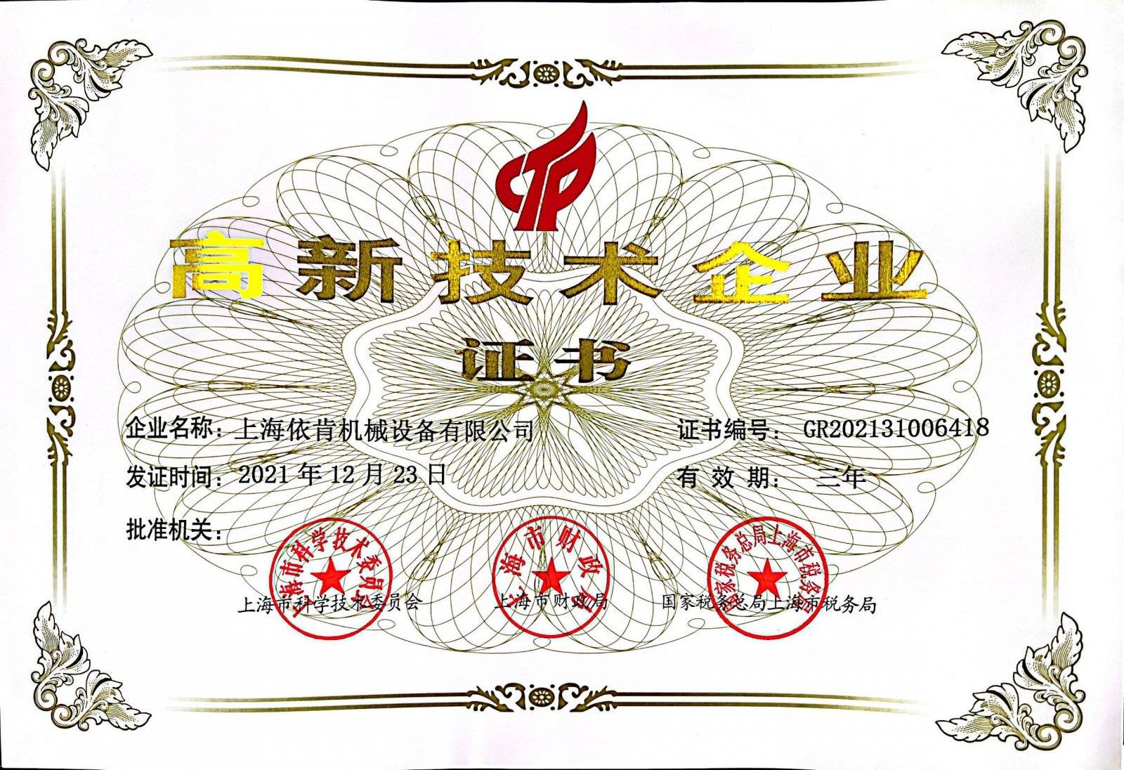 高新技术企业证书