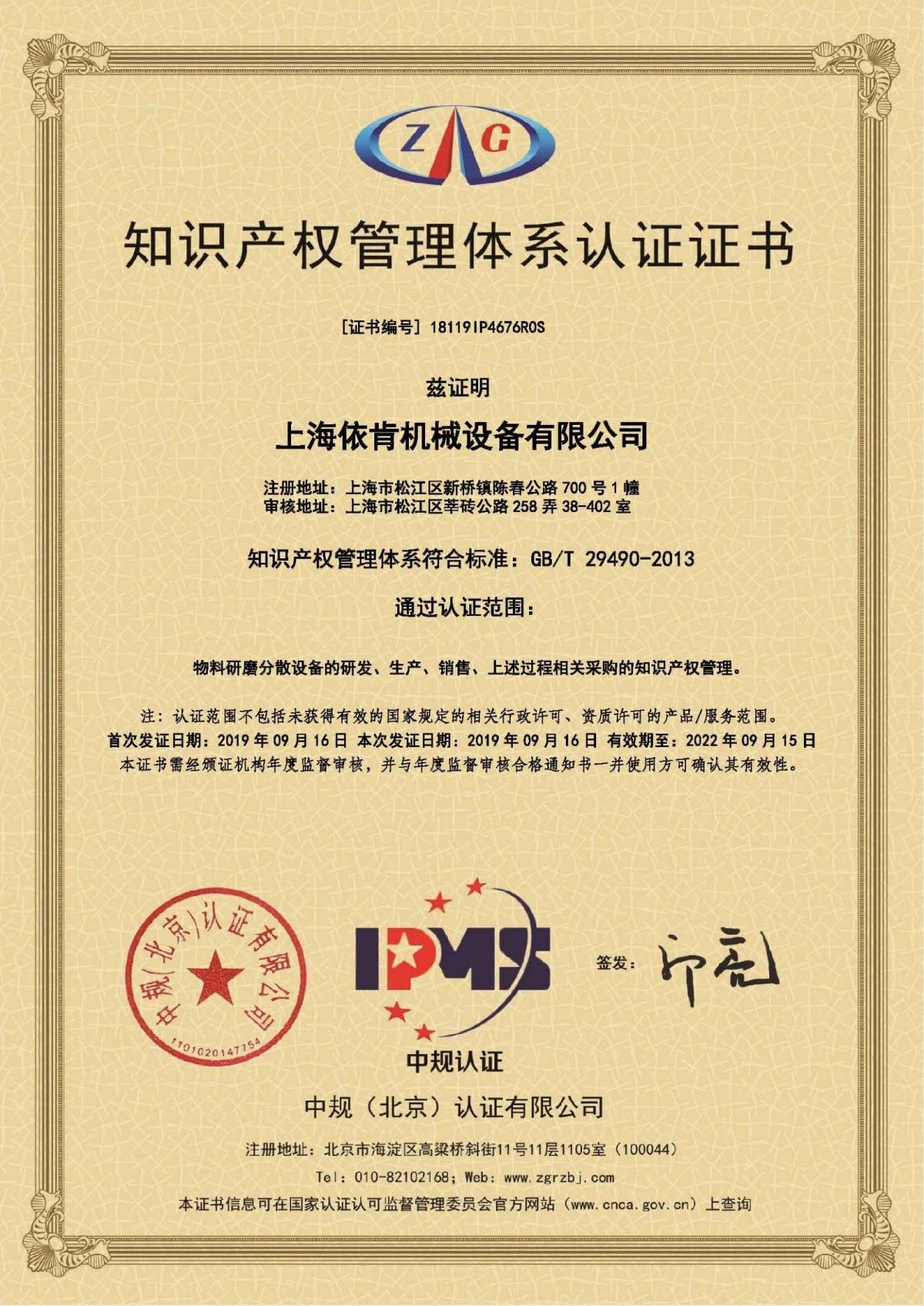 知识产权管体体系认证证书