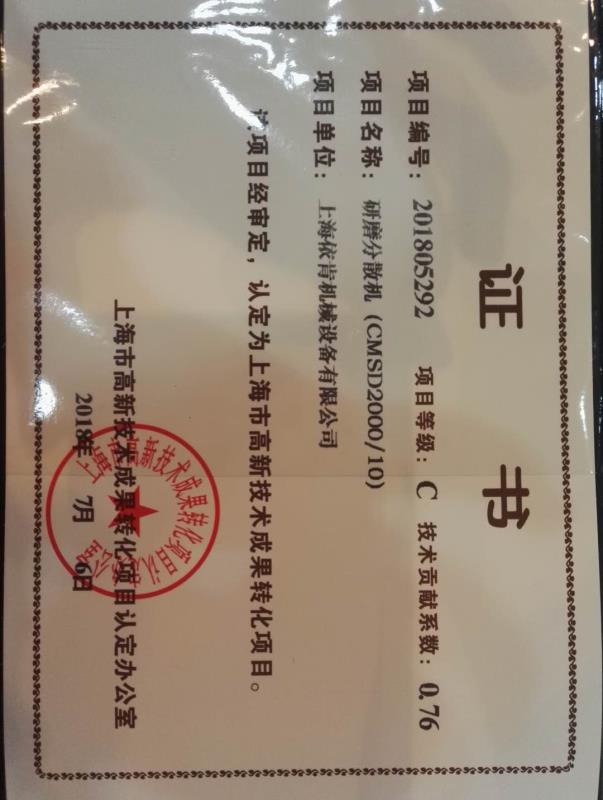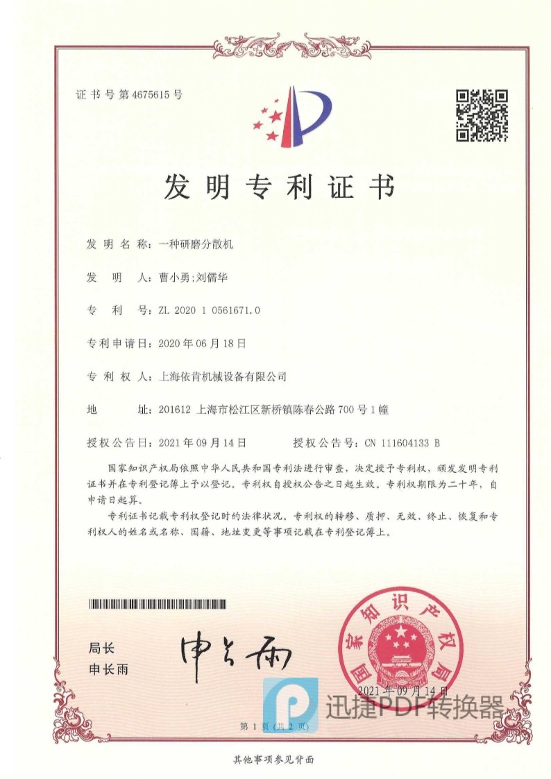 一种研磨分散机 发明专利证书