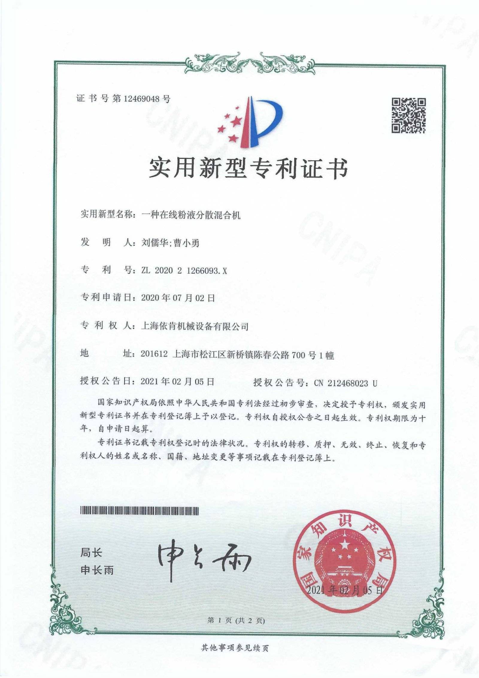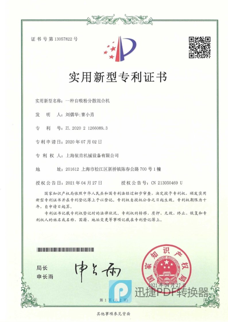 一种在线粉液分散混合机 实用新型专利证书