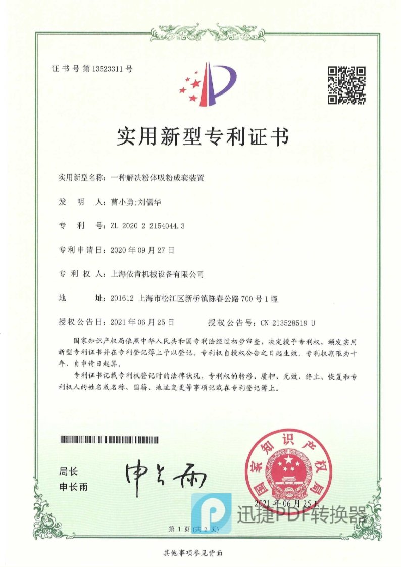 一种解决粉体吸粉成套装置 实用新型专利证书