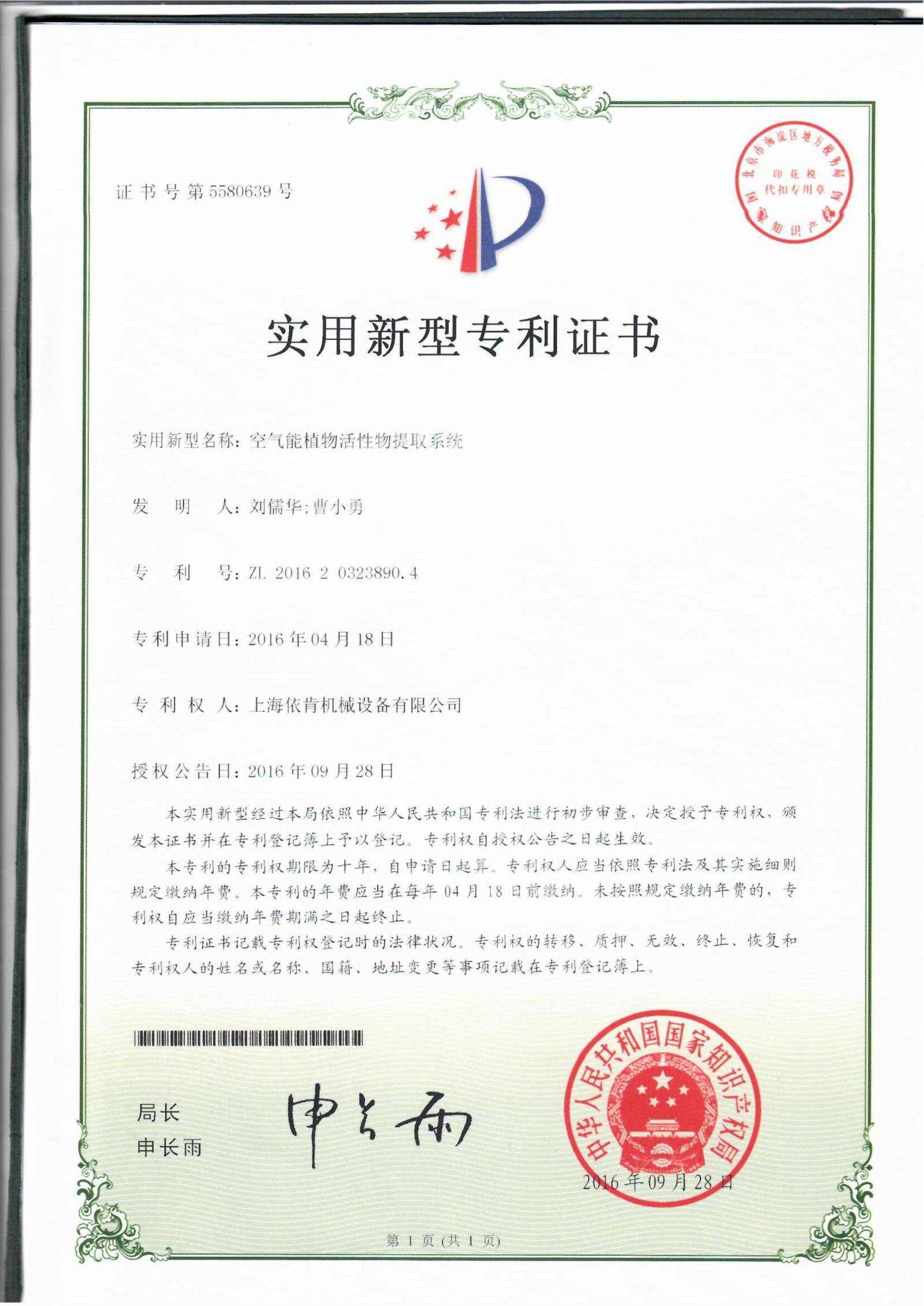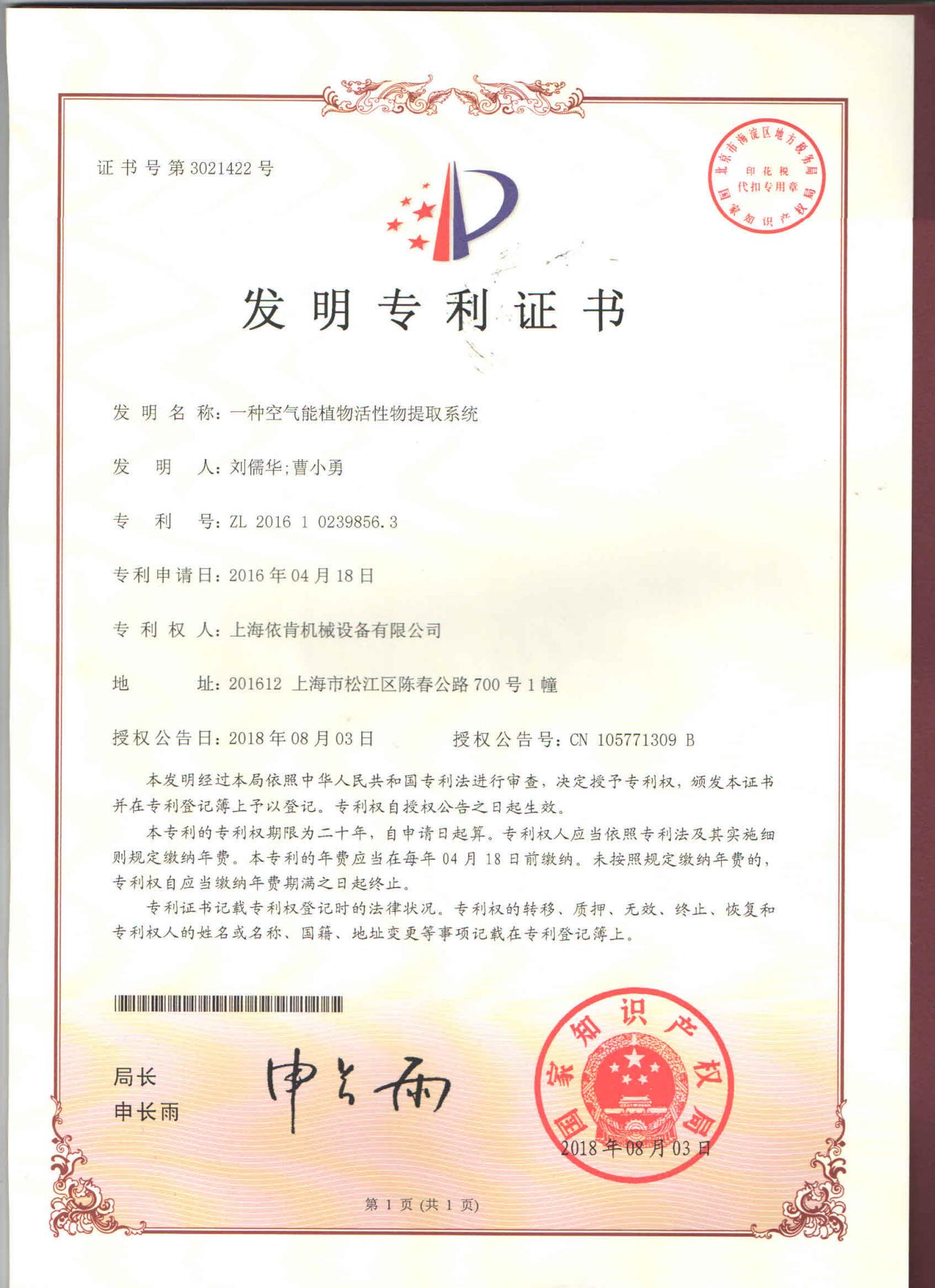 空气能植物活性物提取系统 实用新型专利证书