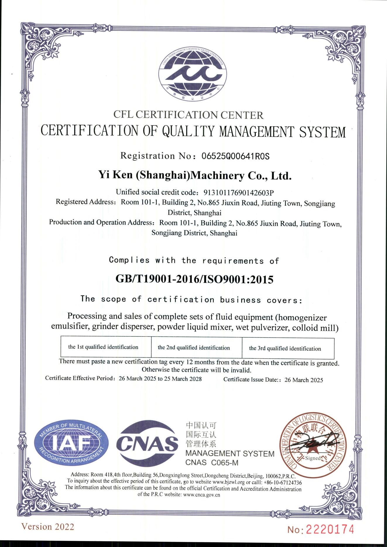 质量管理体系认证证书英文