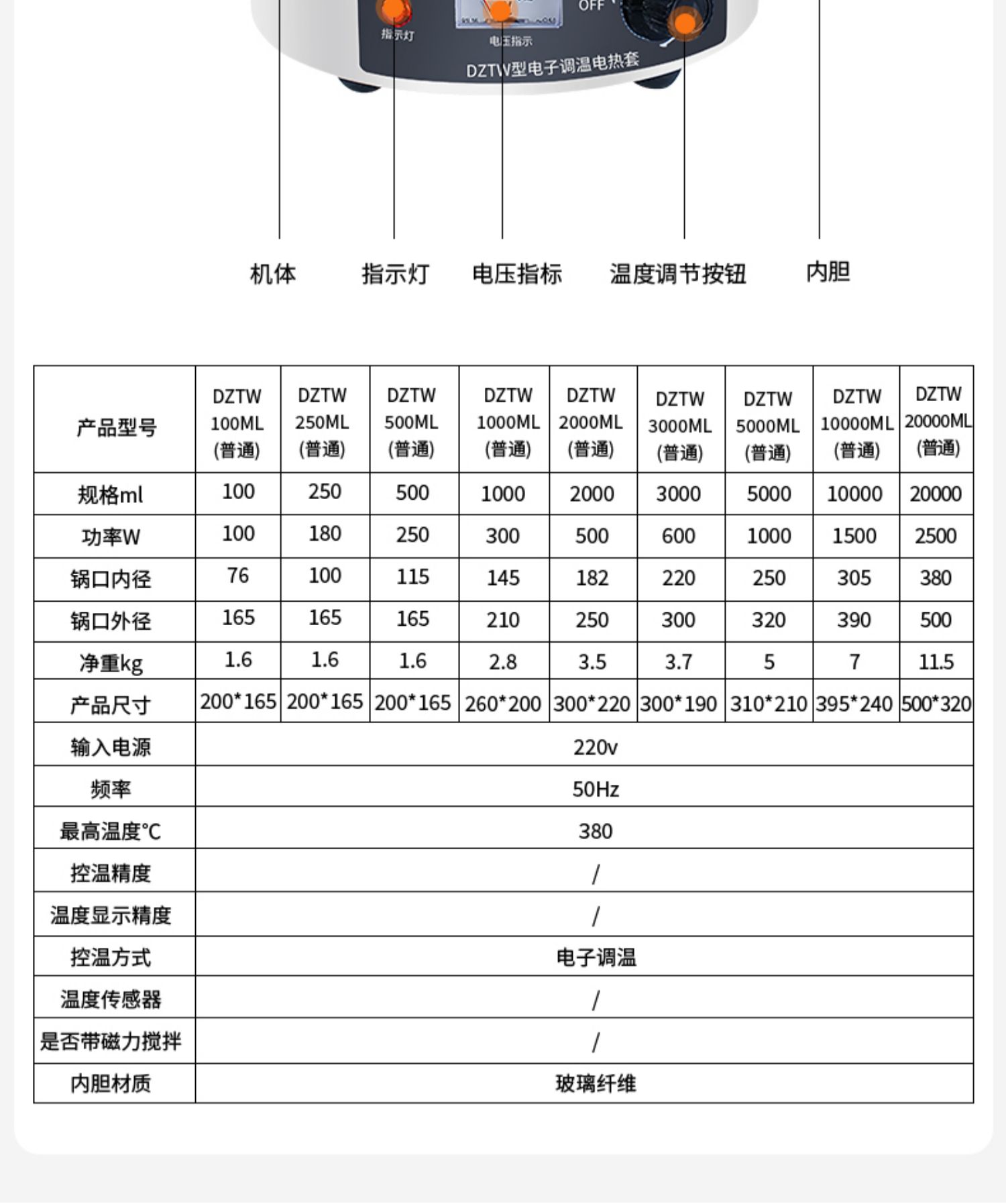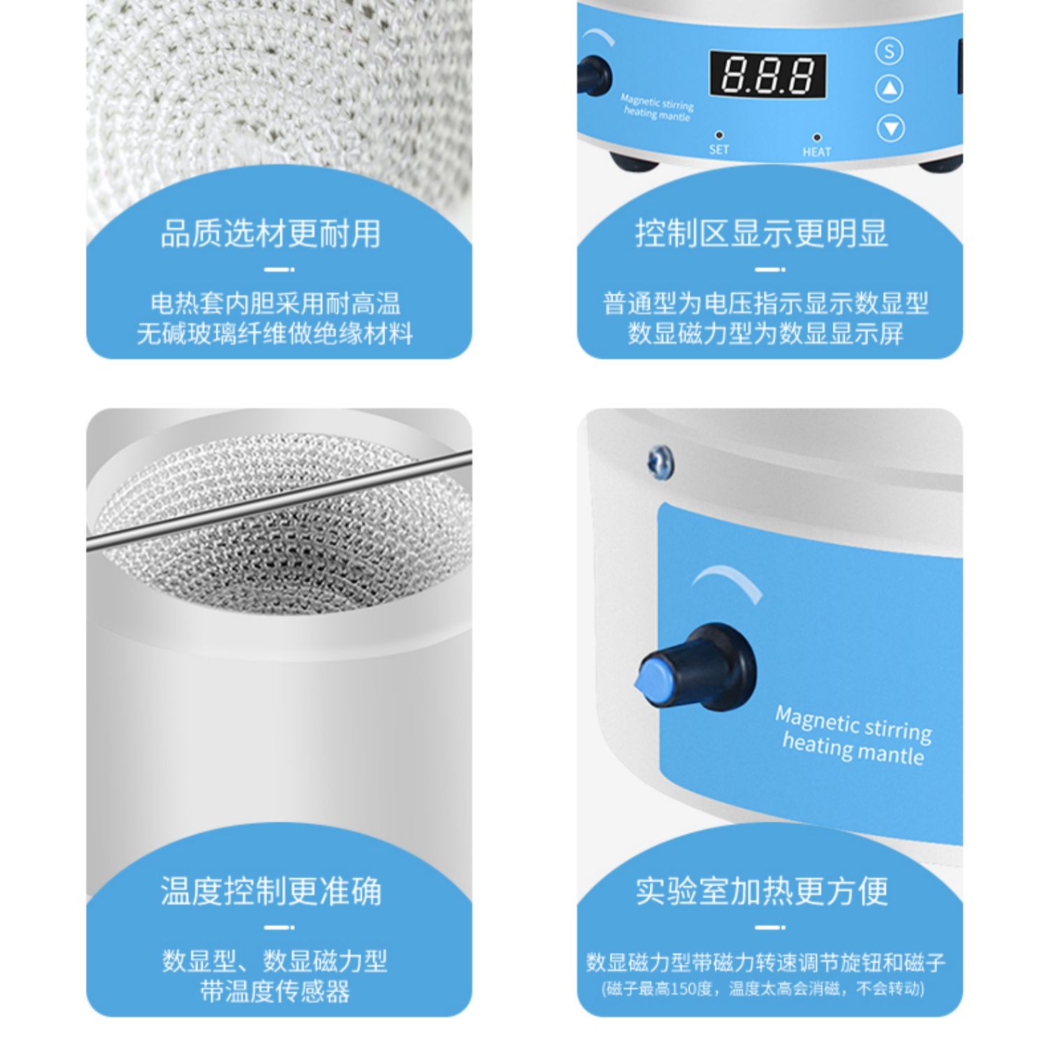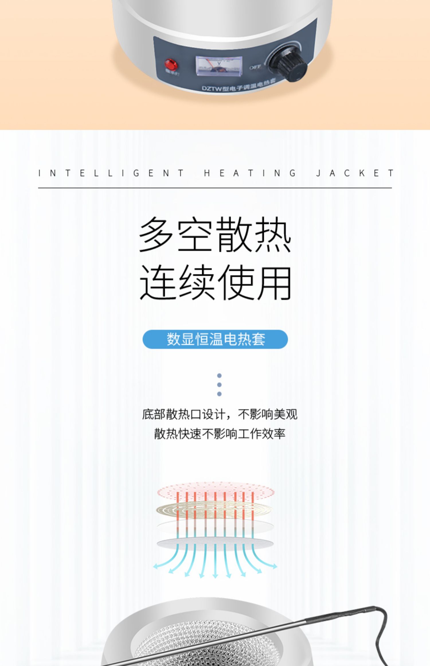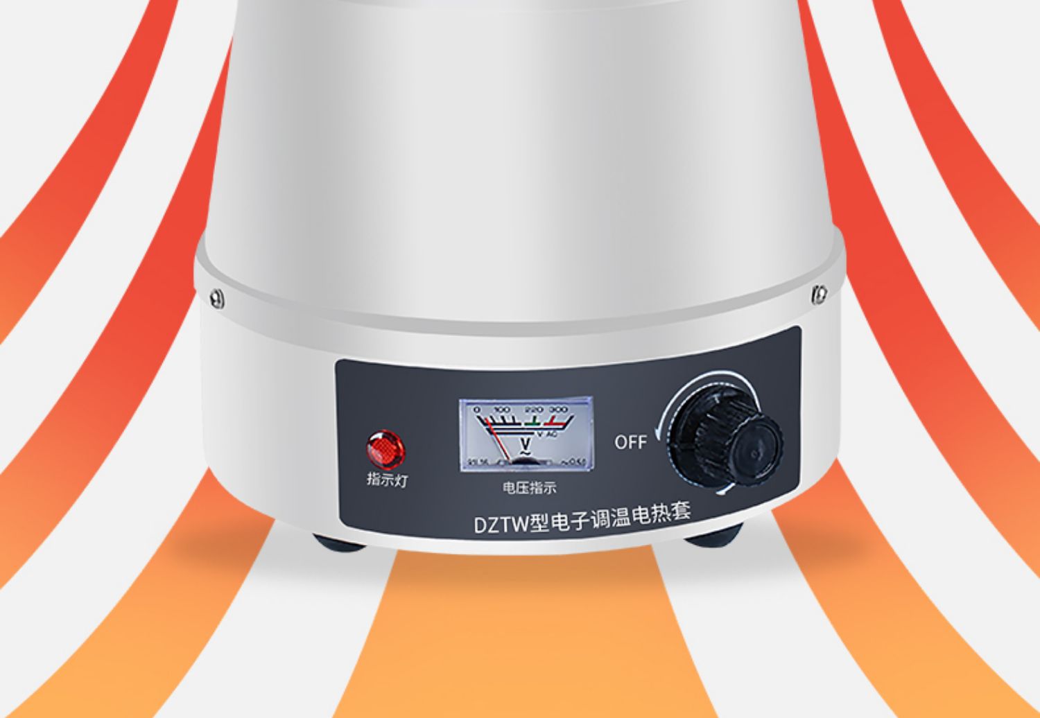 电热套是用无碱玻璃纤维作绝缘材料,用硅酸铝棉经真空定型的半球形保温体保温,外壳一次性注塑成型,上盖采用静电喷塑工艺,由于采用球形加热,可使容器受热面积达到60%以上,