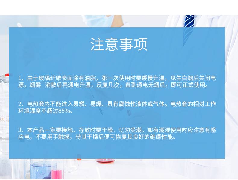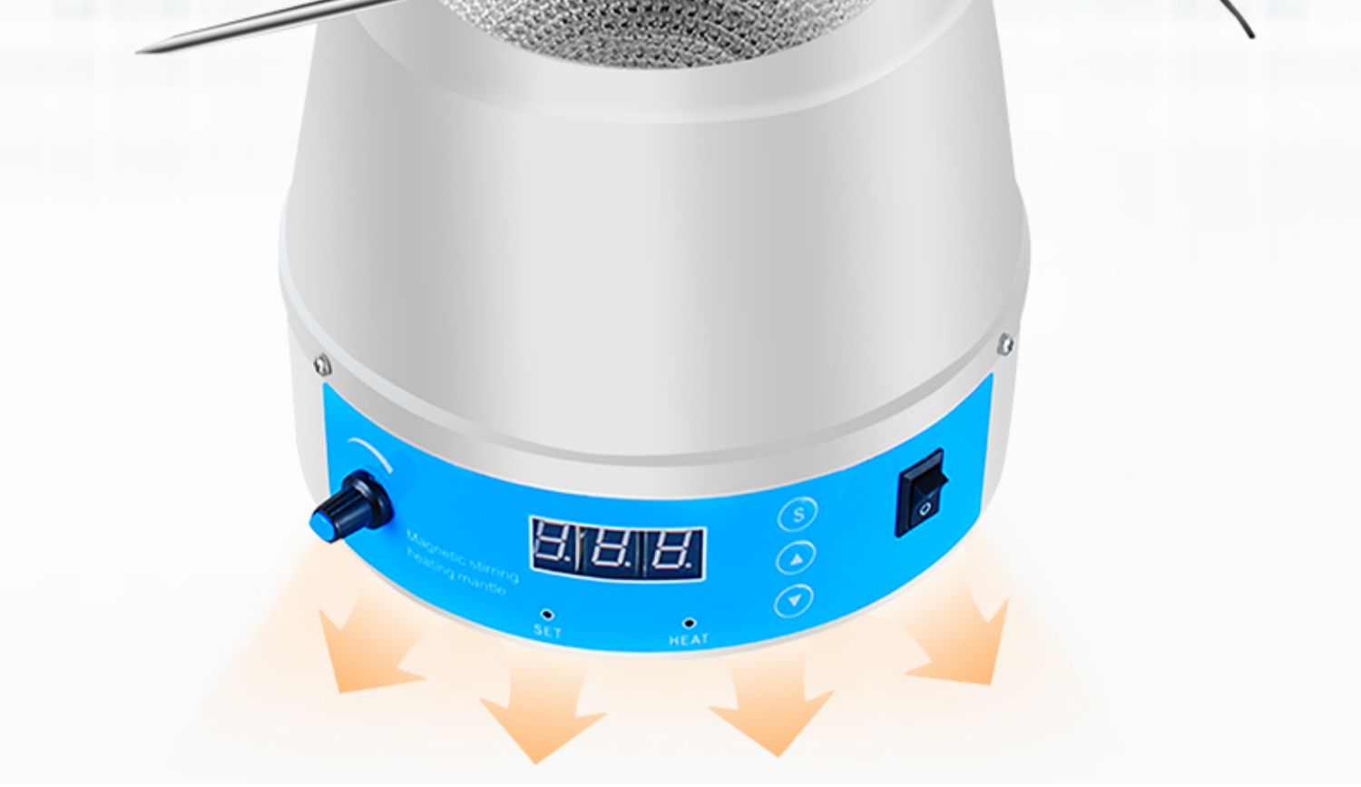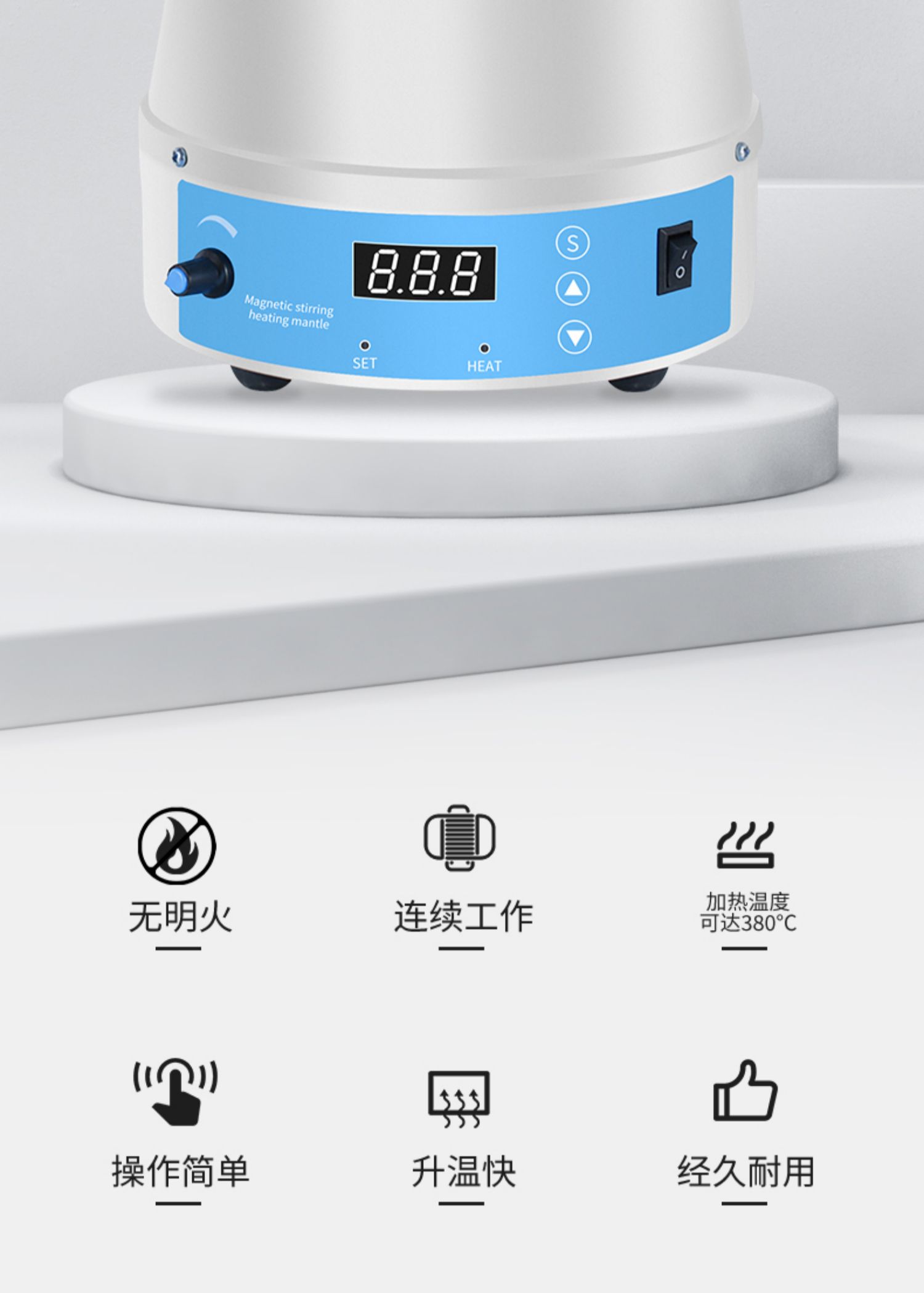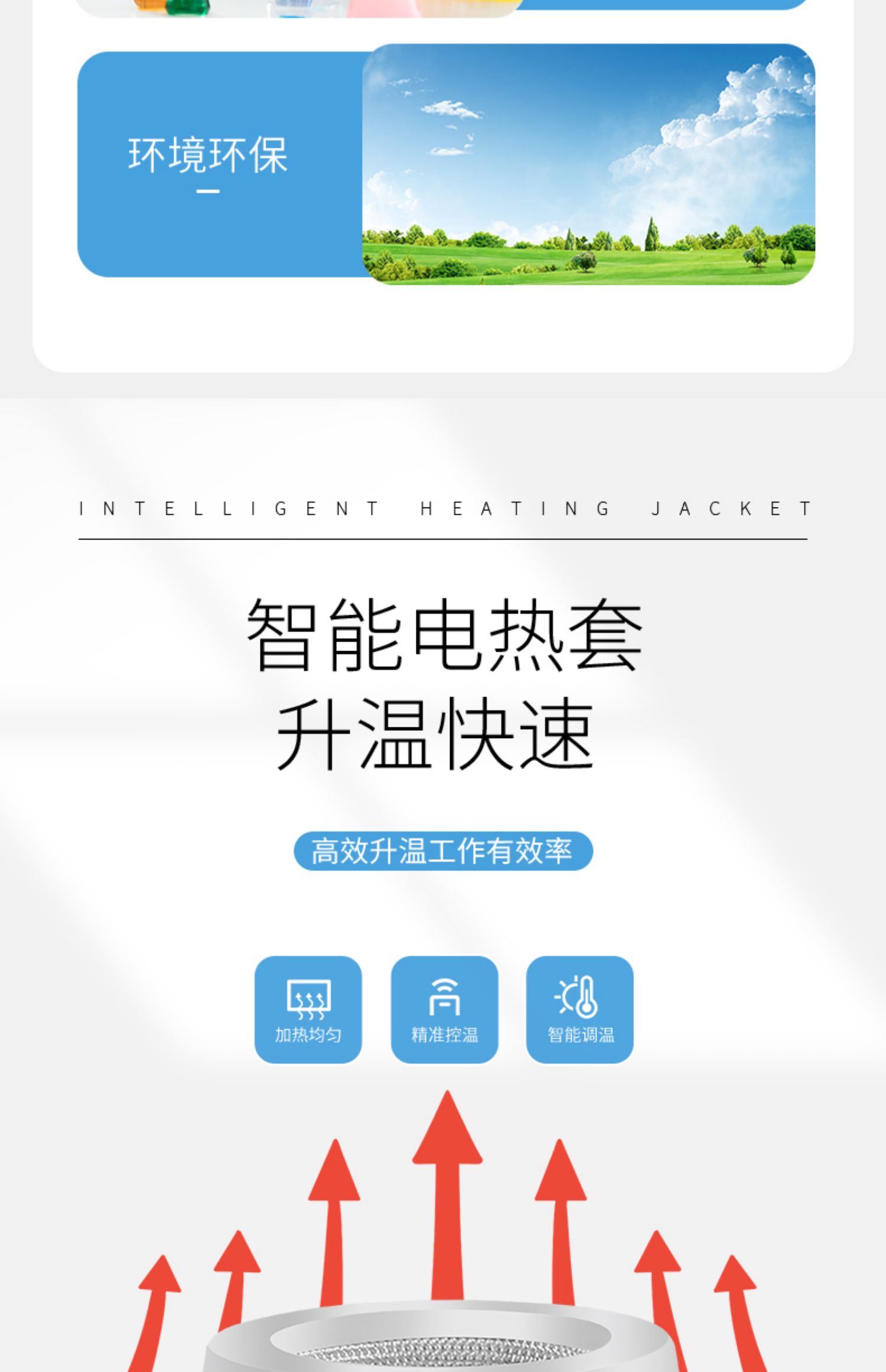 电热套是用无碱玻璃纤维作绝缘材料,用硅酸铝棉经真空定型的半球形保温体保温,外壳一次性注塑成型,上盖采用静电喷塑工艺,由于采用球形加热,可使容器受热面积达到60%以上,