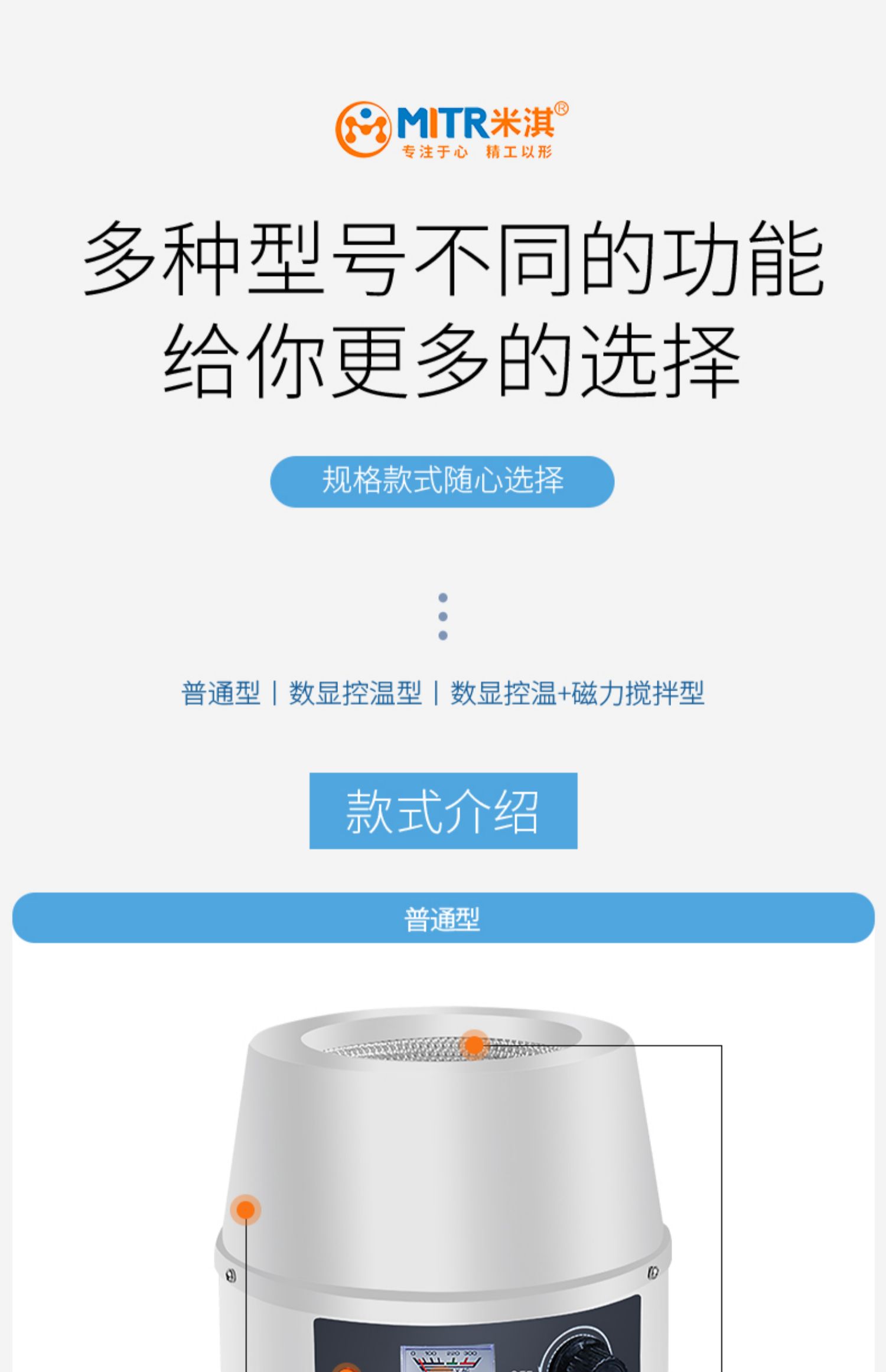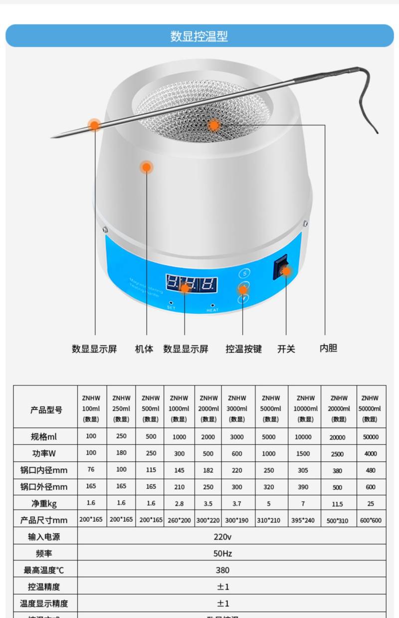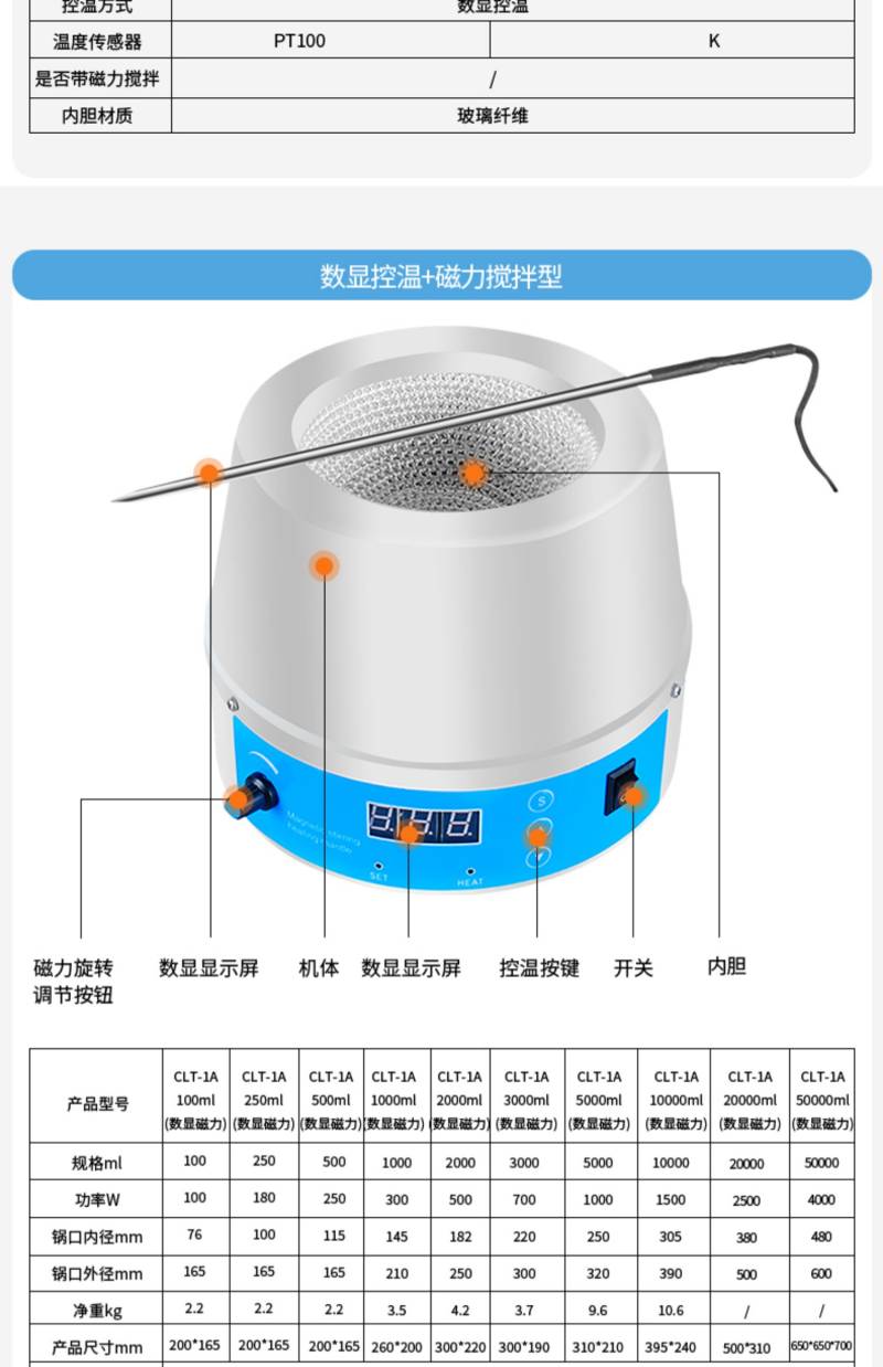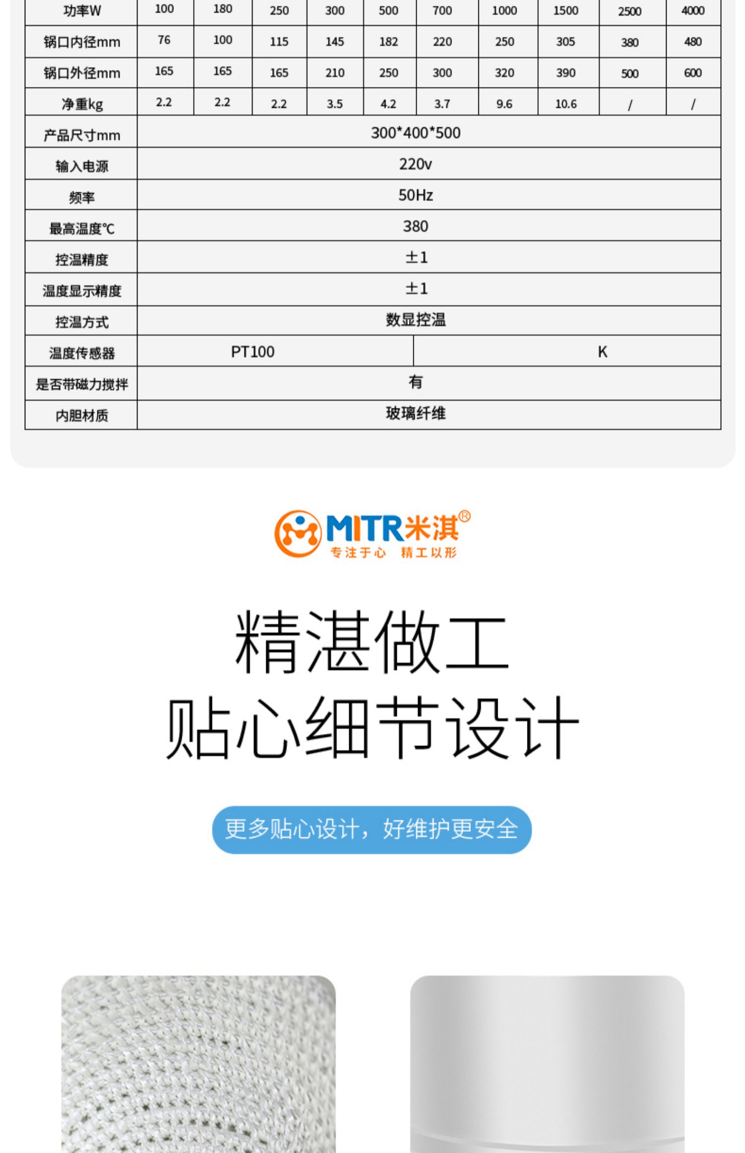 根据米淇MITR官方产品资料显示:数显恒温电热套的非金属电热元件为其他,金属电热元件为其他,烧结气氛为其他,温控精度为1℃,最高温度为380℃,额定温度为100℃,数显恒温电热套的价格为1万元以下,具体型号是CLT-1A100ml数显磁力款,品牌为米淇。