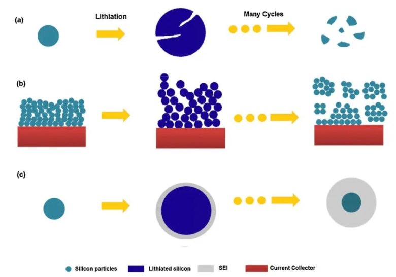 锂离子电池因其能量密度高、循环寿命长、环保等优势逐步在便携式电子产品及电动汽车中得到广泛应用。当前以石墨类材料为负极的锂离子电池容量已逐渐不能满足电动车长续航的要求,硅基材料因其比容量大、放电平台低、储能丰富等优点,是最具潜力的下一代锂电池负极材料。但是硅基材料因其自身因素严重限制了它的商业应用,首