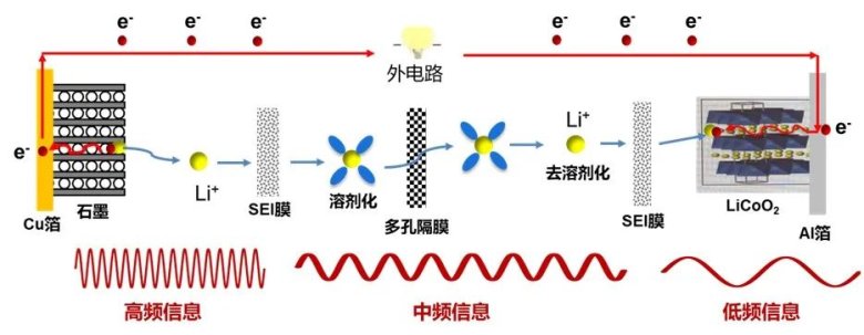 电化学阻抗谱( Electrochemical Impedance Spectroscopy,EIS) 是研究电化学界面问题的重要手段之一,并被广泛应用于研究锂离子电池内部的电化学行为。其原理是将锂电池看作一个黑箱,通过施加一定振幅、不同频率的正弦交流信号,获取频域范围内相应的电信号反馈,再通过解析