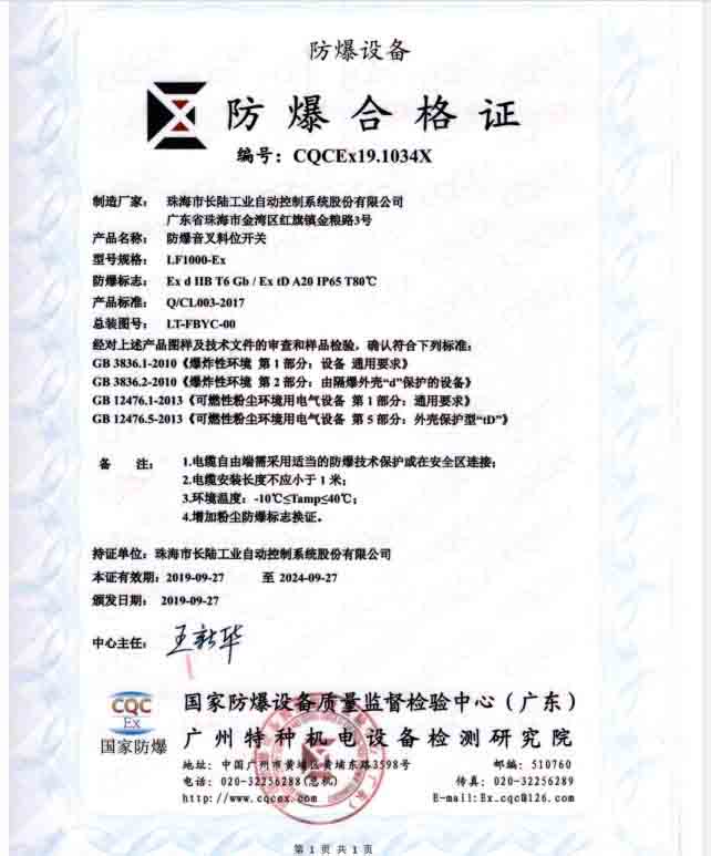 防爆音叉料位开关-气体与粉尘防爆合格证