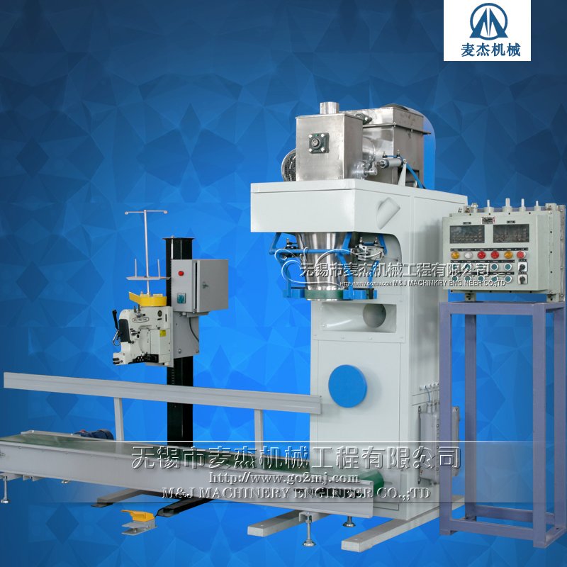 该包装机主要由自动定量包装机(由储料斗、喂料器,称重夹袋斗,揉实机构,电脑控制,气动执行部分等构成)与选配部分(输送机、缝口机/热合机)组成。