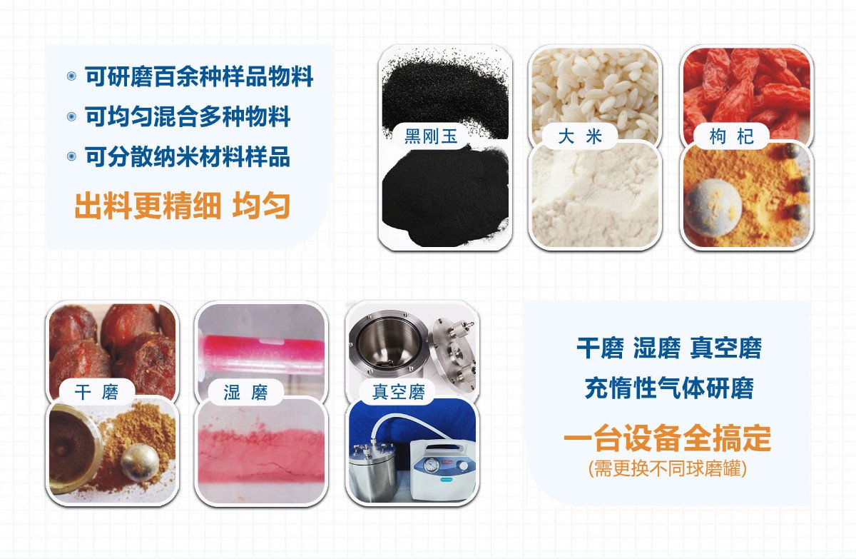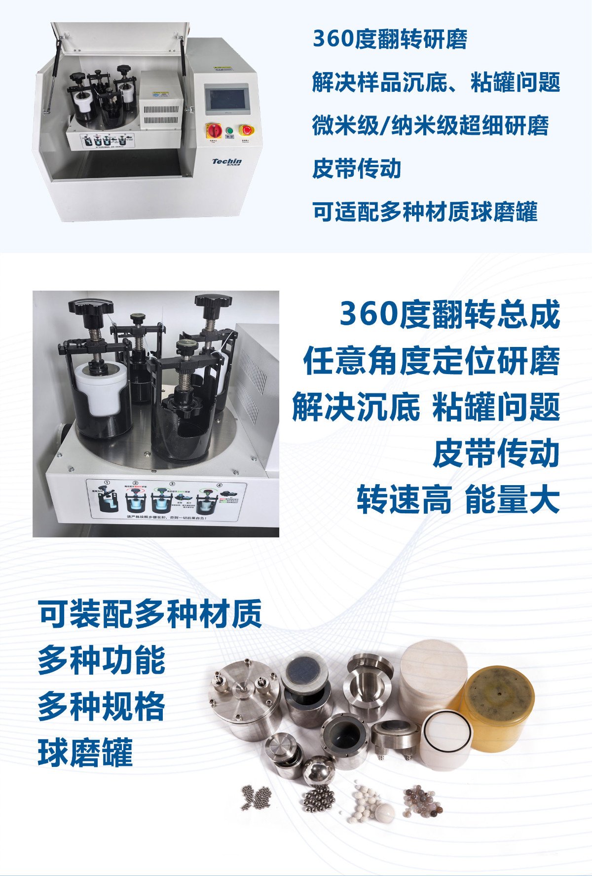 TJQ全方位球磨仪对于常规行星式球磨机工作过程中出现的“沉底”和“粘罐”现象有良好的解决处理效果,能将样品物料研磨的更加彻底。