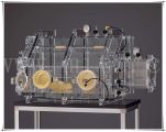 手套箱主要由主箱体、过渡室两部分组成。如用户有其它特殊要求,也可以根据需要进行设计制造。主箱体上有两个(或两个以上)手套操作接口,分布在箱体的前边(或前后两边),这使得本操作箱能被一个(或几个)人同时操作,提高了箱体的使用效率。另外,在箱体的前面(或前后)都有观察窗,操作者能够清楚地观察到箱体内的操