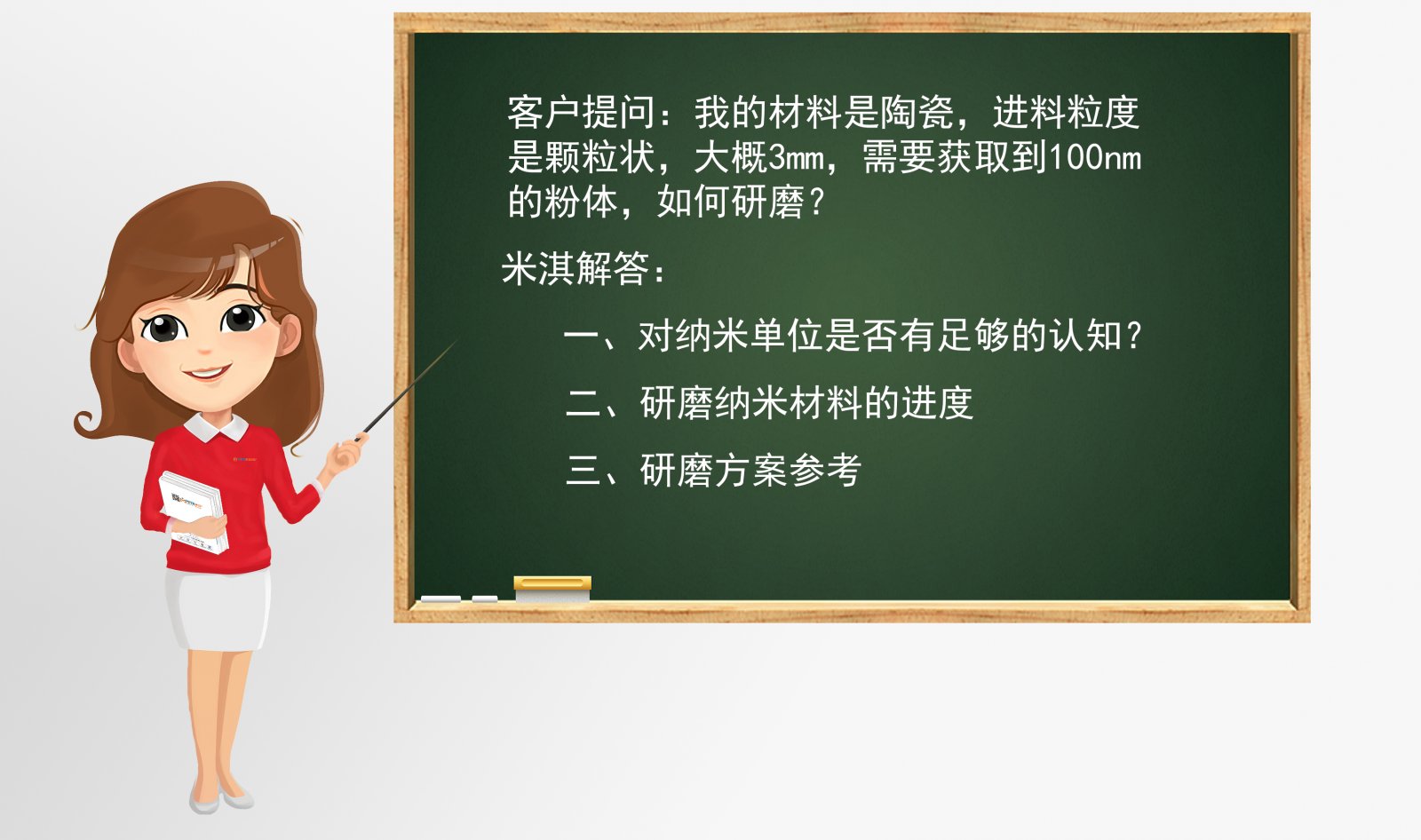 客户提问:我的材料是陶瓷,进料粒度是颗粒状,大概3mm,需要获取到100nm的粉体,如何研磨?米淇解答:根在研磨方案出来之前,我需要了解几个参数,一、对纳米单位是否有足够的认识,之前很多客户说要磨到纳米级,但是实际我们做出10um就足够满足了他们的实验要求了,这类就是属于纳米单位没有实际的概念.二、