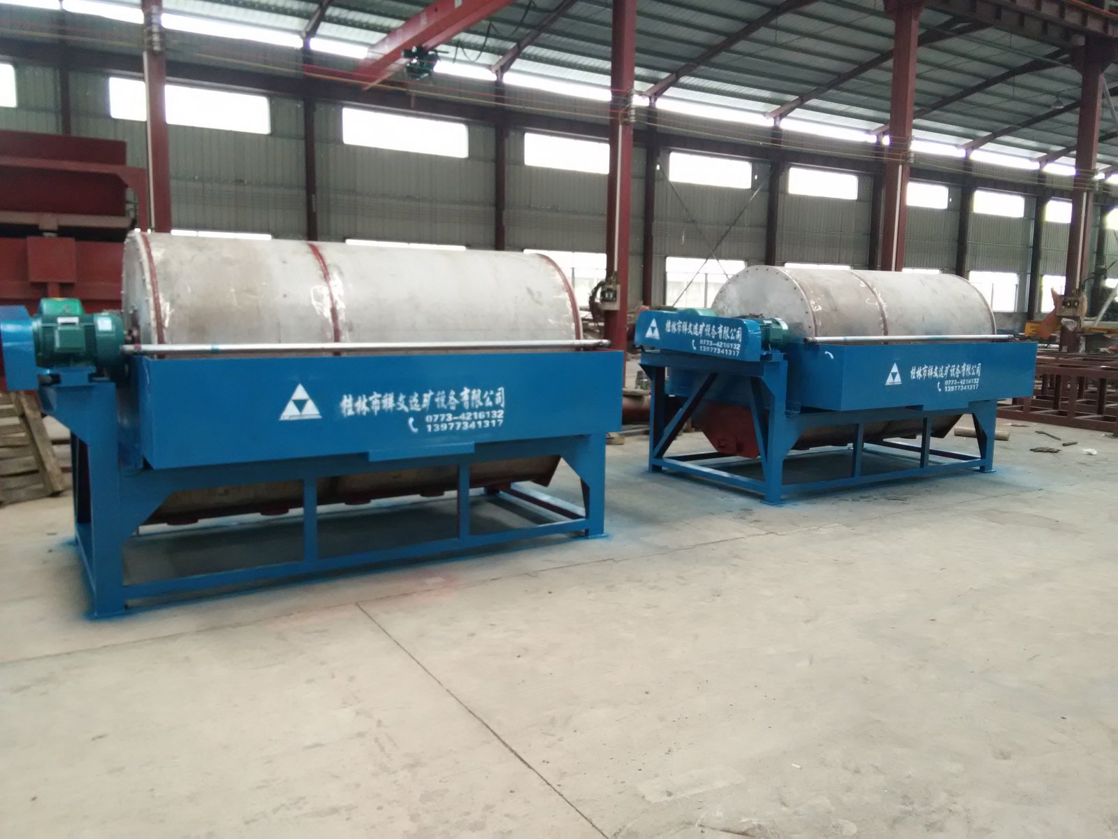 二、永磁筒式铁矿磁选机、河沙磁选机特性:永磁筒式(湿选)磁选机适用于湿式选别细颗粒的强磁性矿物,或者除去非磁性矿物中混杂的强磁性矿物。本机可以连续给矿和排矿,磁场深度大,工作间隙大,具有较大的处理能力。其原理是当矿浆进入磁场区时,其中强磁性矿物被吸附在圆筒表面,弱磁性和非磁性矿物被甩掉排出,而吸附在圆筒表面上的强磁性矿物随圆筒旋转,被带出磁场区,用冲洗水冲入精矿槽中,完成分选作业。