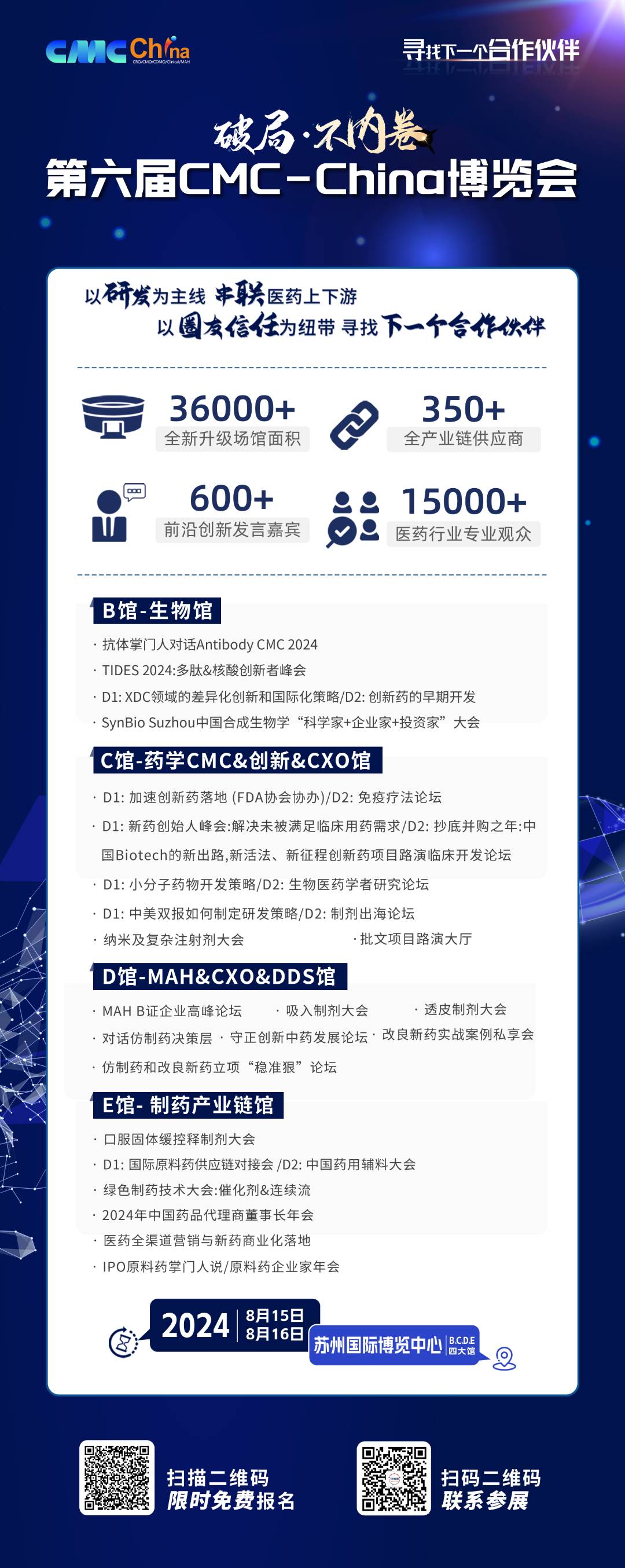 2024年8月15-16日,在苏州博览中心,将会举办第六届CMC-China中国国际生物&化学制药博览会。