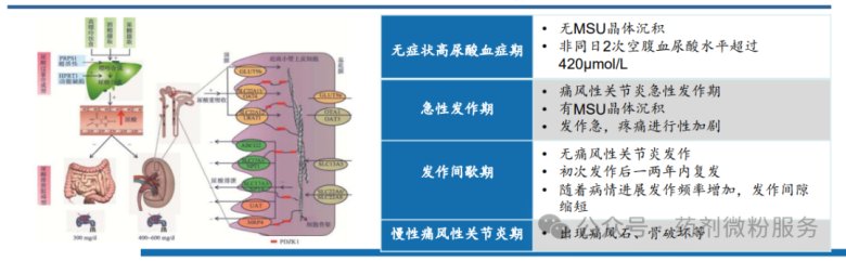 痛风与高尿酸血症痛风是由于人体嘌呤代谢过程失调或尿酸的排泄异常而引起的一种晶体性关节炎高尿酸血症是尿酸盐晶体在关节沉积的主要病理生理学基础,是痛风发生的最直接病因,高尿酸血症和痛风是一个连续、慢性的病理过程,这导致患者往往需要长期甚至终身服药。痛风的发病机制痛风的进展可分为四个病理生理阶段:高尿酸血